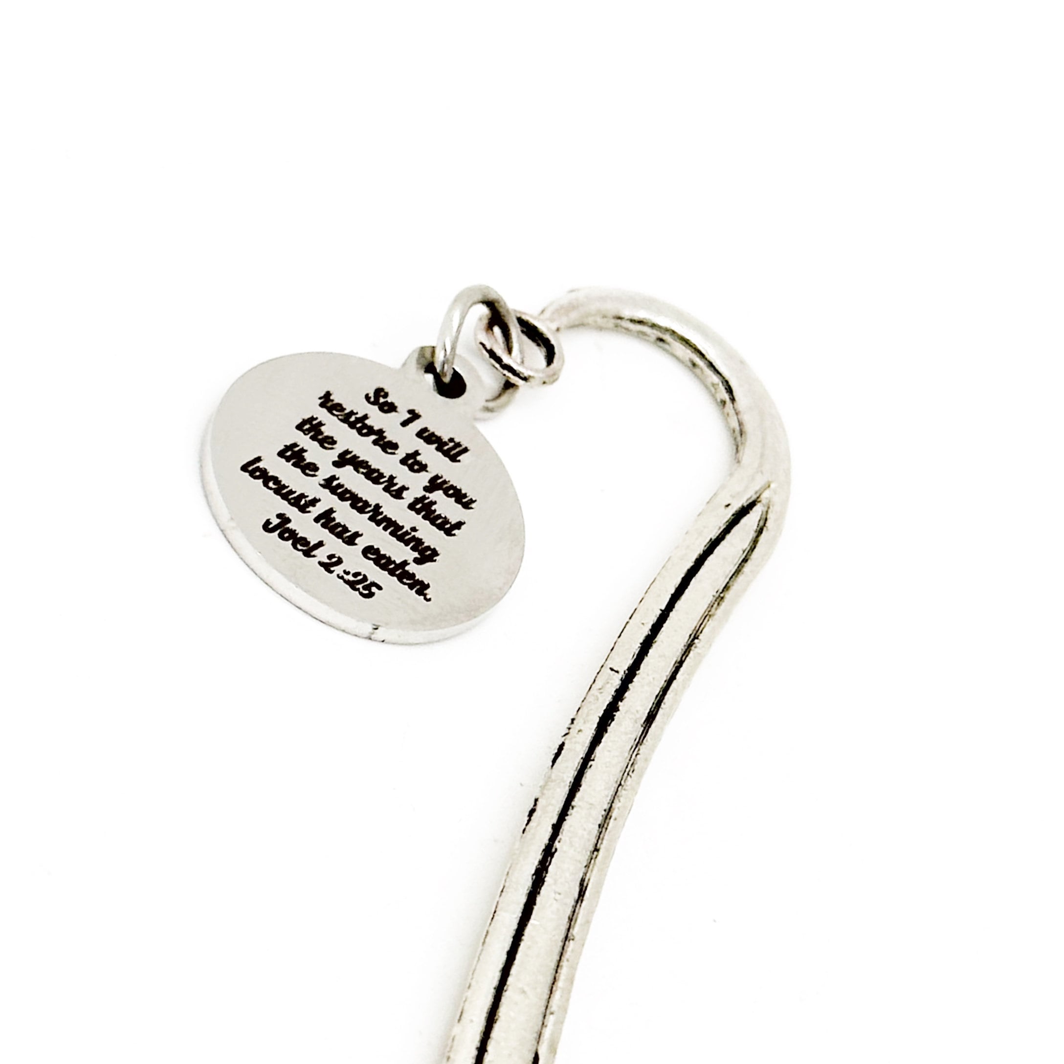 This is a great reader gift. It has a "So I will restore to you the lost years the swarming locust has eaten" from Joel 2:25 stainless steel laser engraved charm on a metal bookmark. The bookmark measures approx. 4.9 Inches in length.