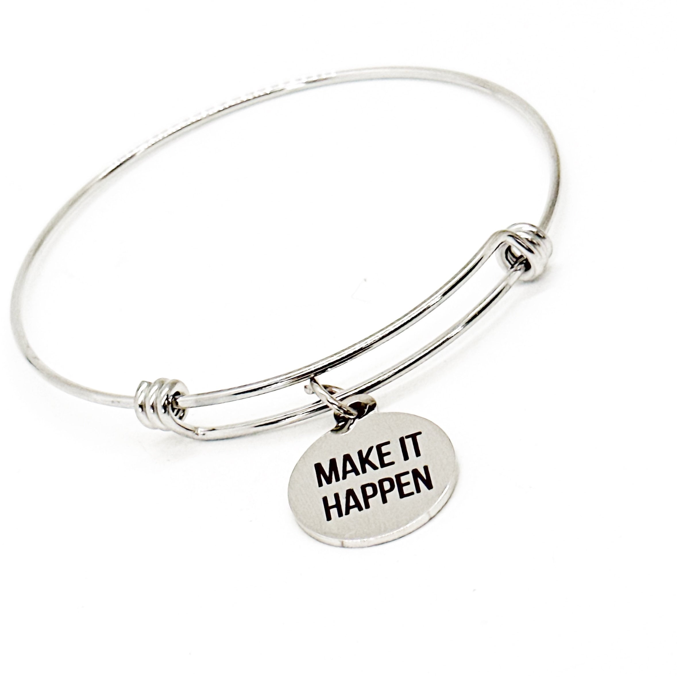This is a beautiful bangle bracelet with a laser engraved stainless steel charm that has "Make It Happen" on it. All components are made of high quality stainless steel so there is no worry of tarnish or color changing.