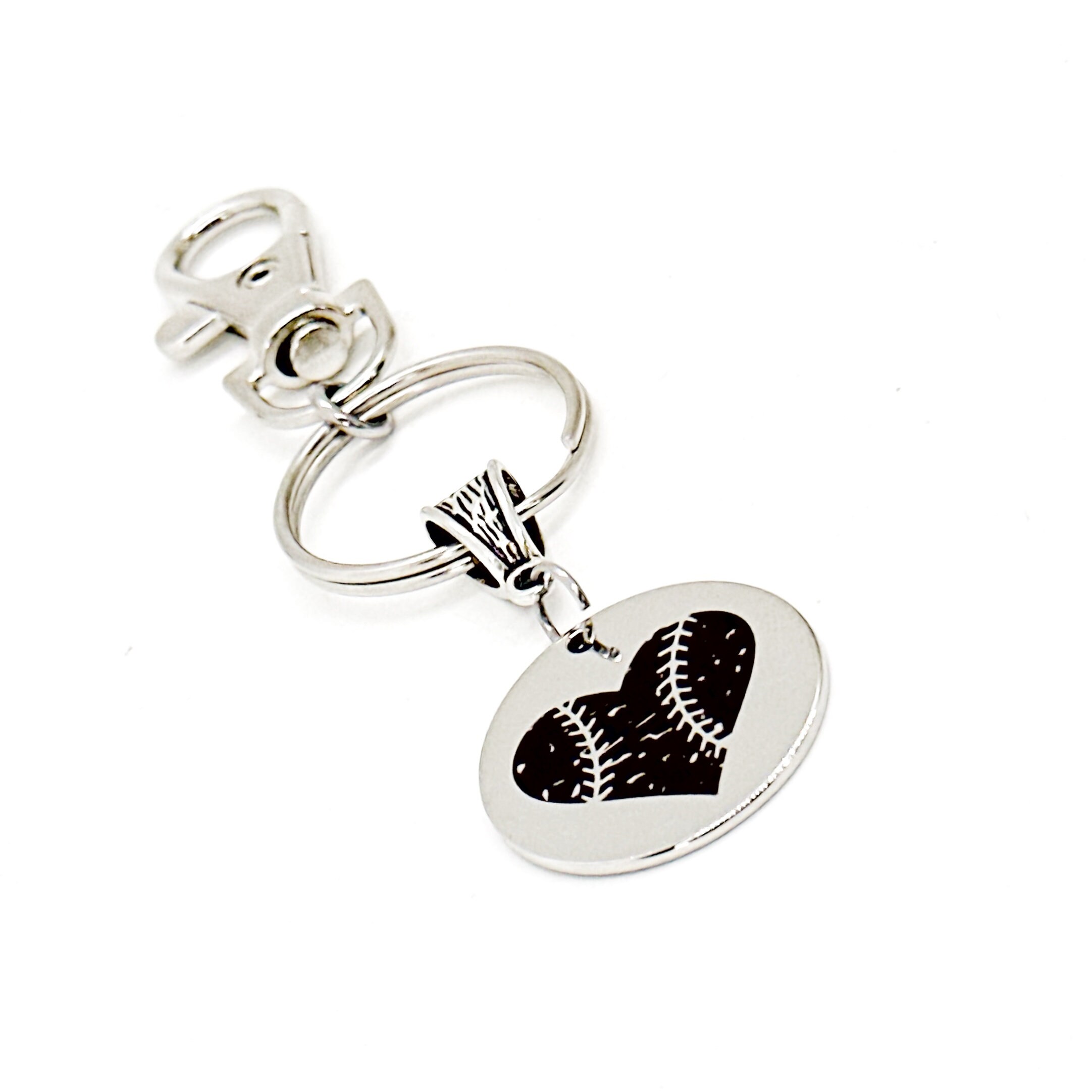 This is a great keychain gift . The keyring can be clipped onto your bag to make it easy to access without digging to the bottom of the bag. It has an engraved charm with an engraved heart with baseball or softball laces on it. The charm measures approx. 1 inch across.