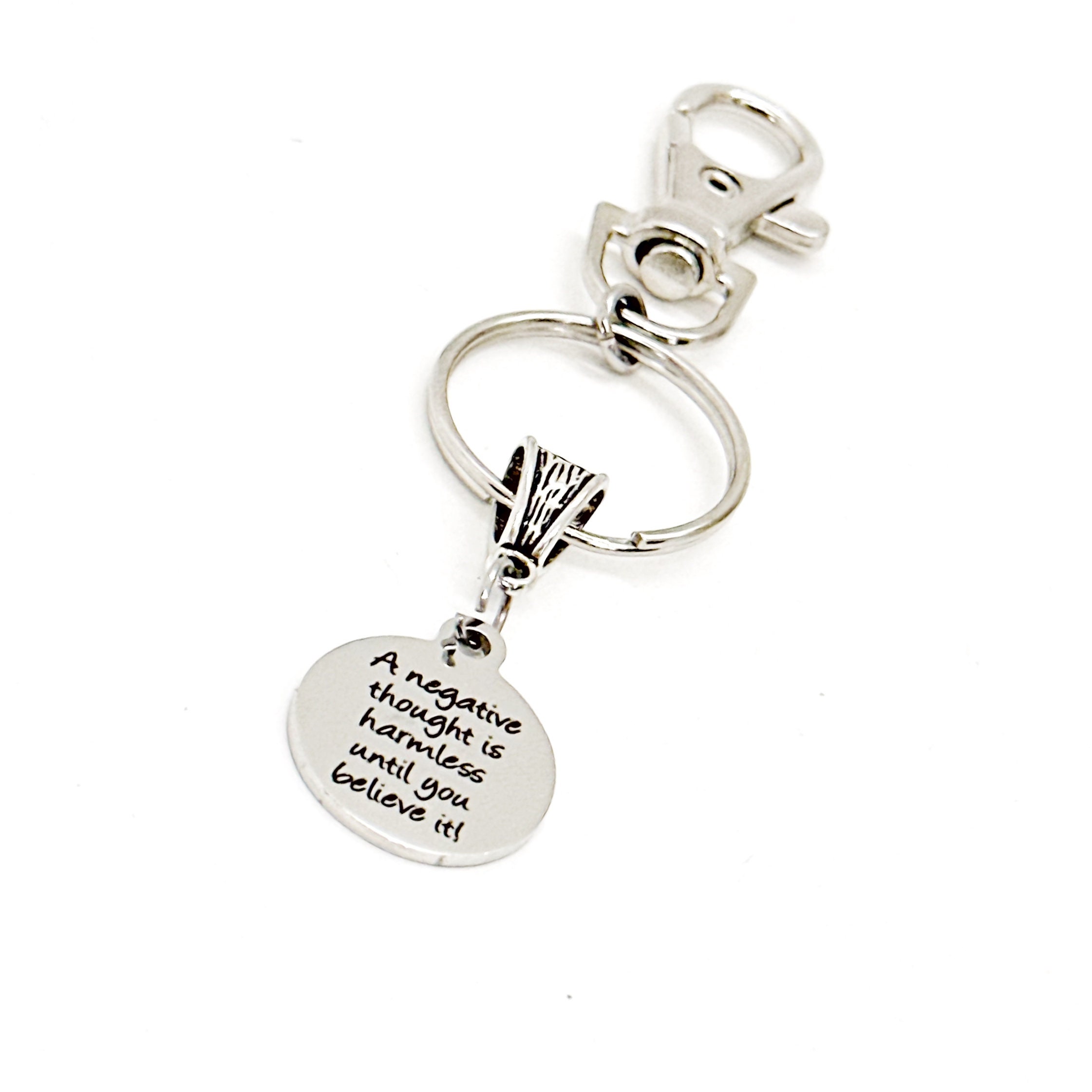 This is a great keychain gift . The keyring can be clipped onto your bag to make it easy to access without digging to the bottom of the bag. It has an engraved charm with “A negative thought is only positive until you believe it” on it. The charm measures approx. 3/4 inch across.
