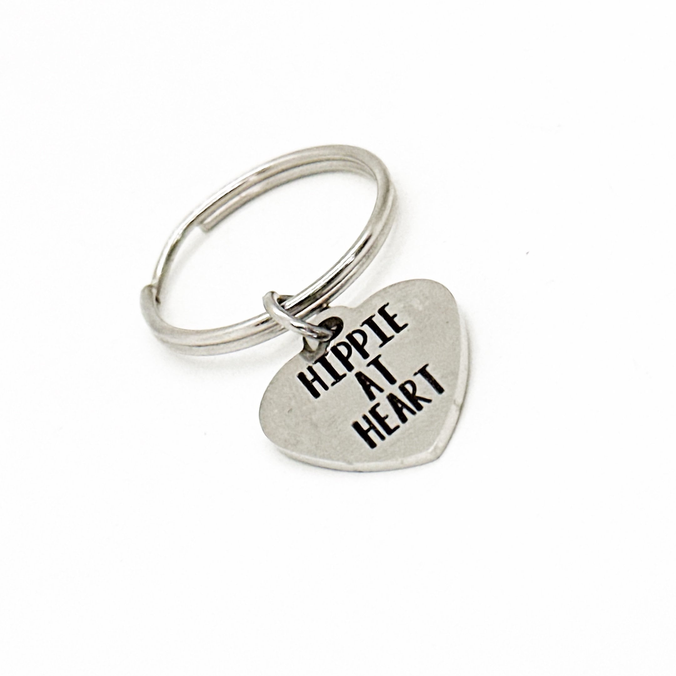 This is a wonderful keychain gift! It has a stainless steel engraved charm with “Hippie At Heart” on it. The charm measures approx. 3/4 inch across.