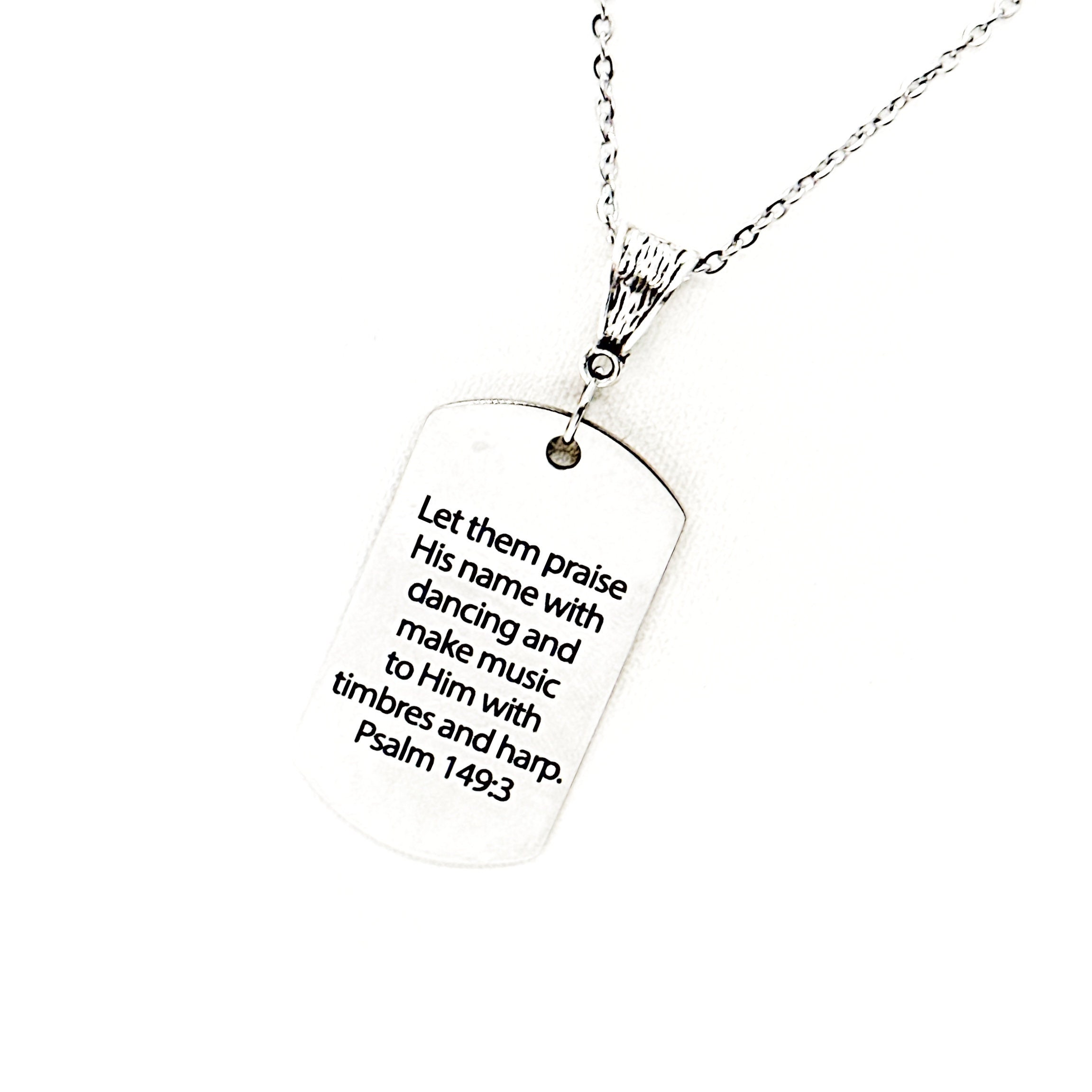 This is a stainless steel laser engraved pendant on a stainless steel link chain with a silvertone bail. The pendant says “Let them praise His name with dancing and make music to Him with timbres and harp” from Psalm 149:3 on it.