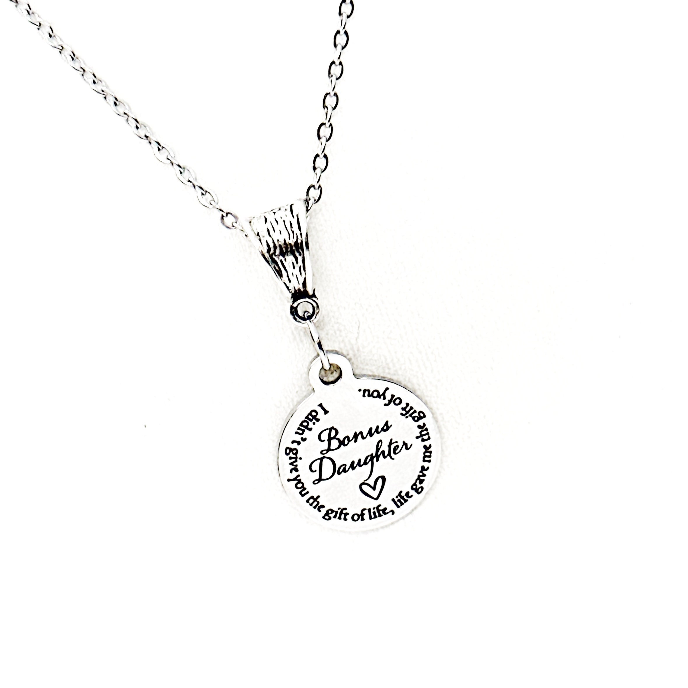 This is a stainless steel laser engraved pendant on a stainless steel link chain with a silvertone bail. The pendant says “Bonus Daughter - I didn’t give you the gift of life, life gave me the gift of you” on it.