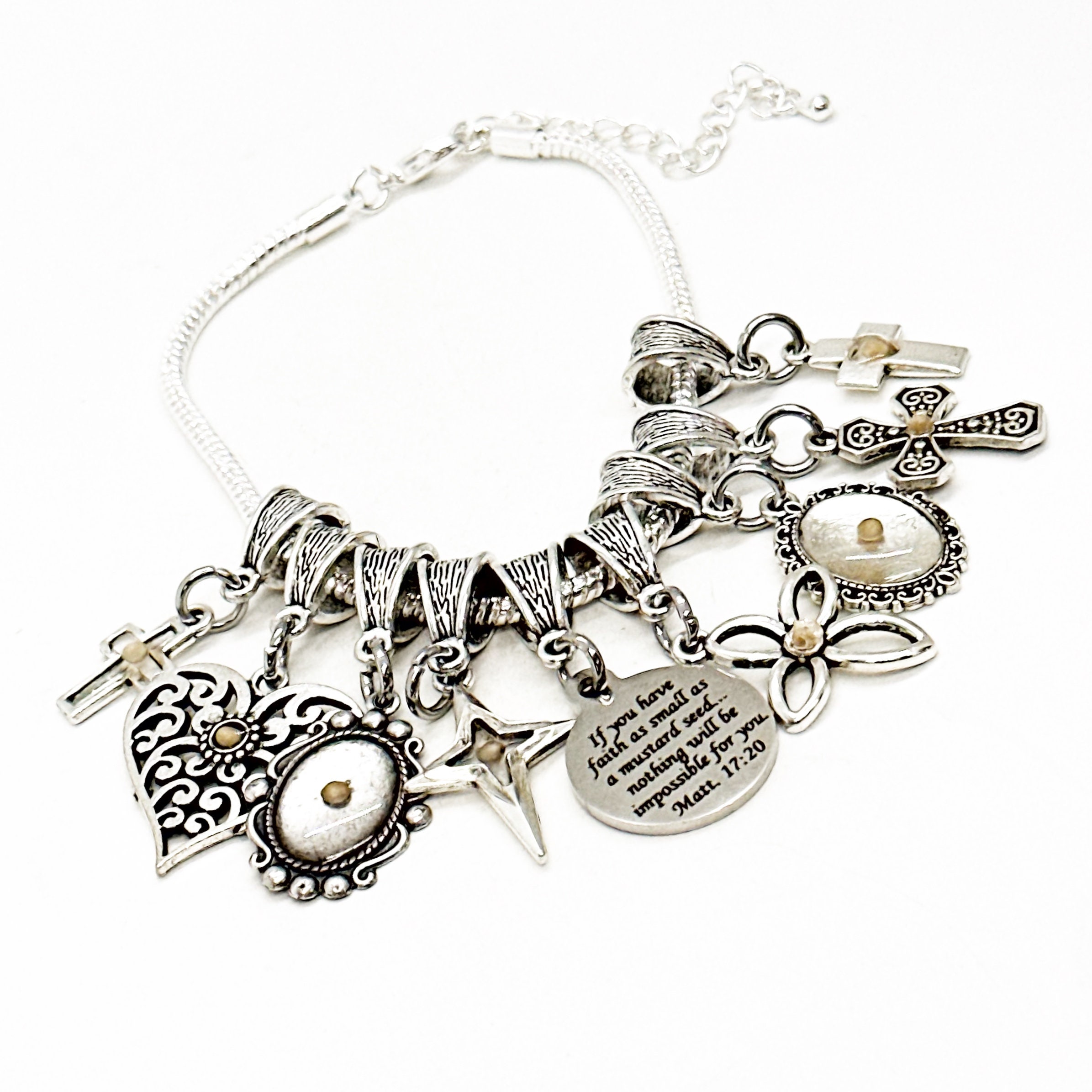 This is a beautiful bracelet with a collection of our most popular mustard seed charms and a a laser engraved stainless steel charm that has “If you have faith as small as a mustard seed… nothing will be impossible for you” from Matthew 17:20 on it.