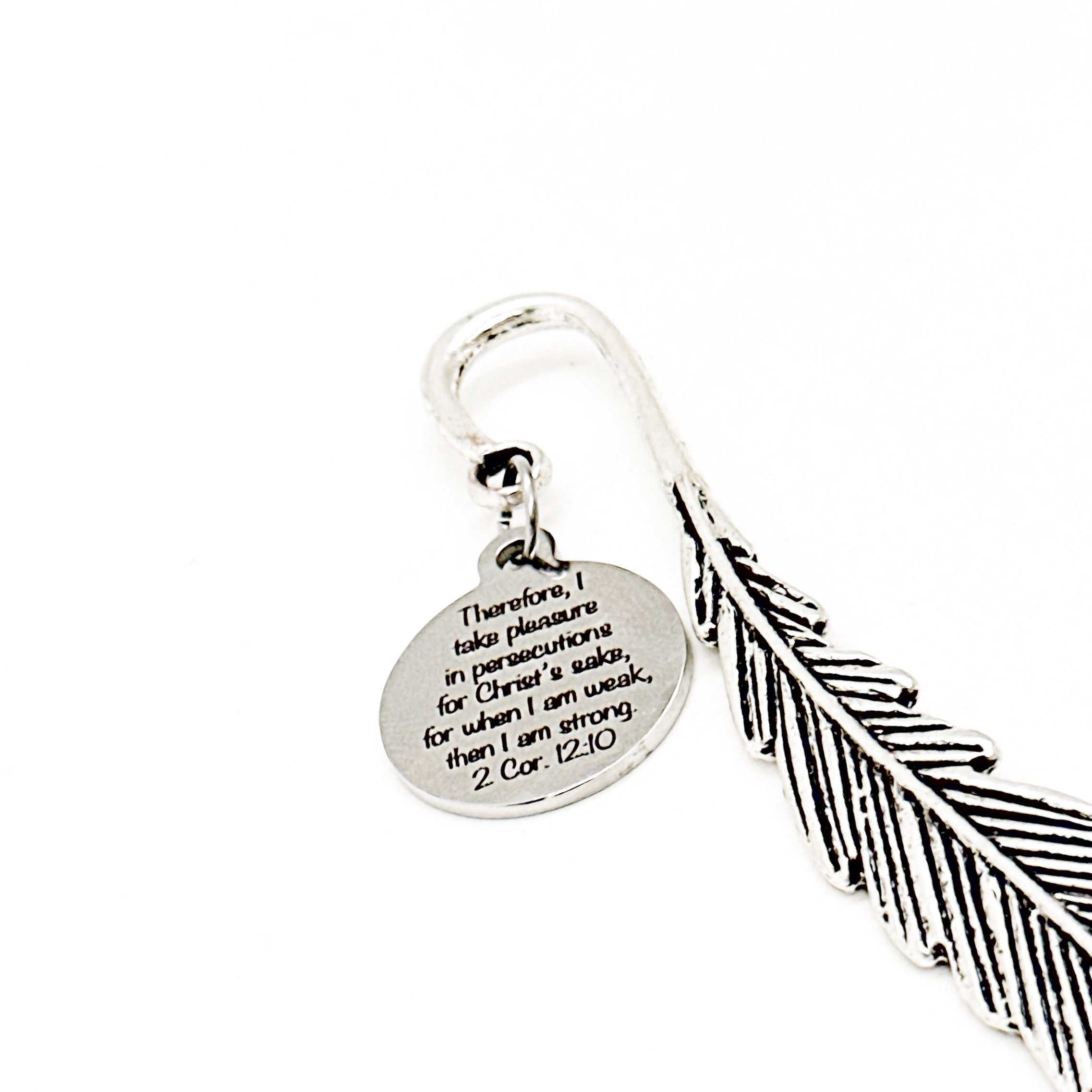 This bookmark would be a great encouraging Christian planner gift bookmark or reader gift. It has a stainless steel laser engraved charm with “Therefore, I take pleasure in persecutions for Christ’s sake for when I am weak then I am strong” from 2 Cor. 12:20 on it. The charm measures approx. 3/4 inch across.