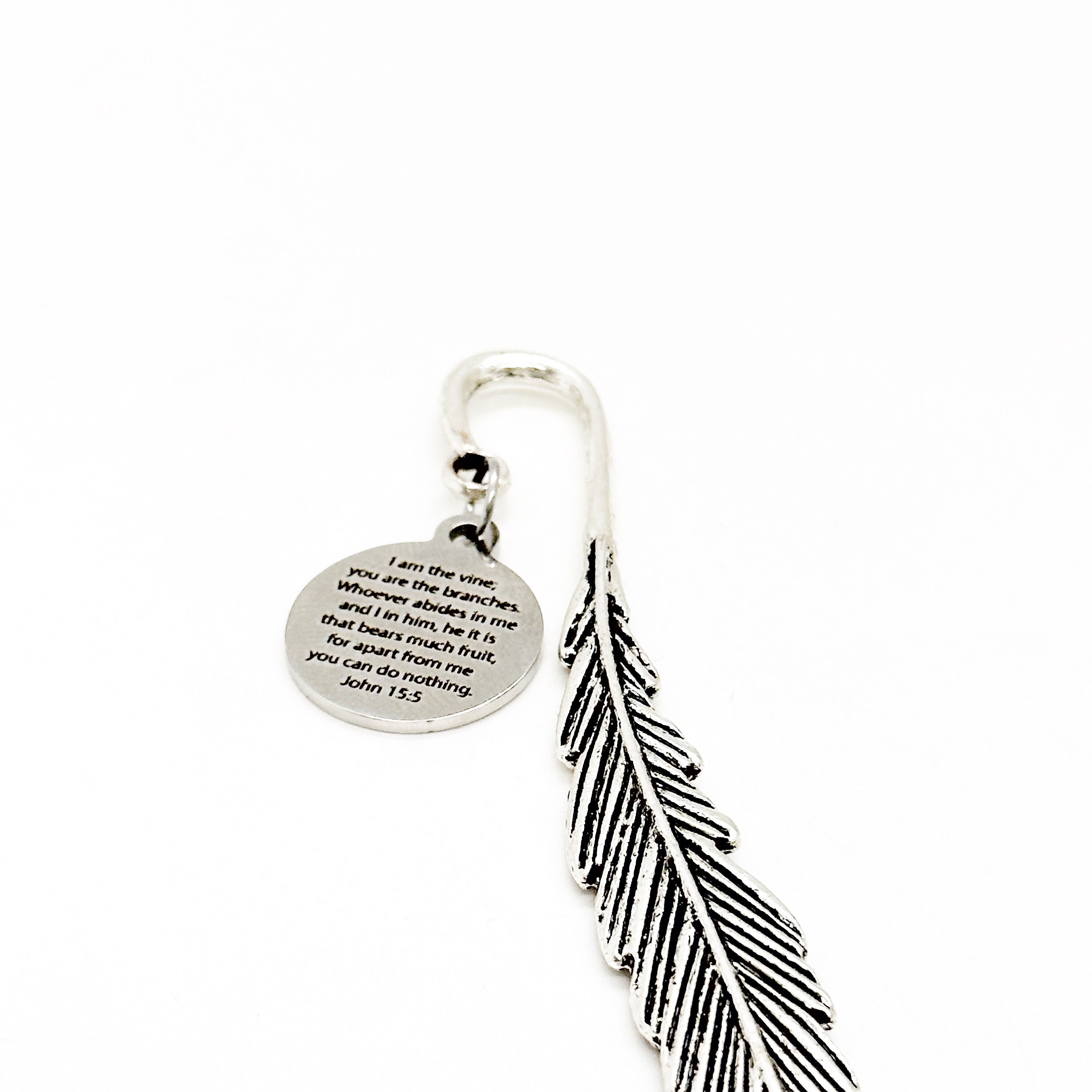 This bookmark would be a great encouraging Christian planner gift bookmark or reader gift. It has a stainless steel laser engraved charm with “I am the vine; you are the branches. Whoever abides in me and I in him, he it is that bears much fruit, for apart from me you can do nothing” from John 15:5 on it. The charm measures approx. 3/4 inch across.