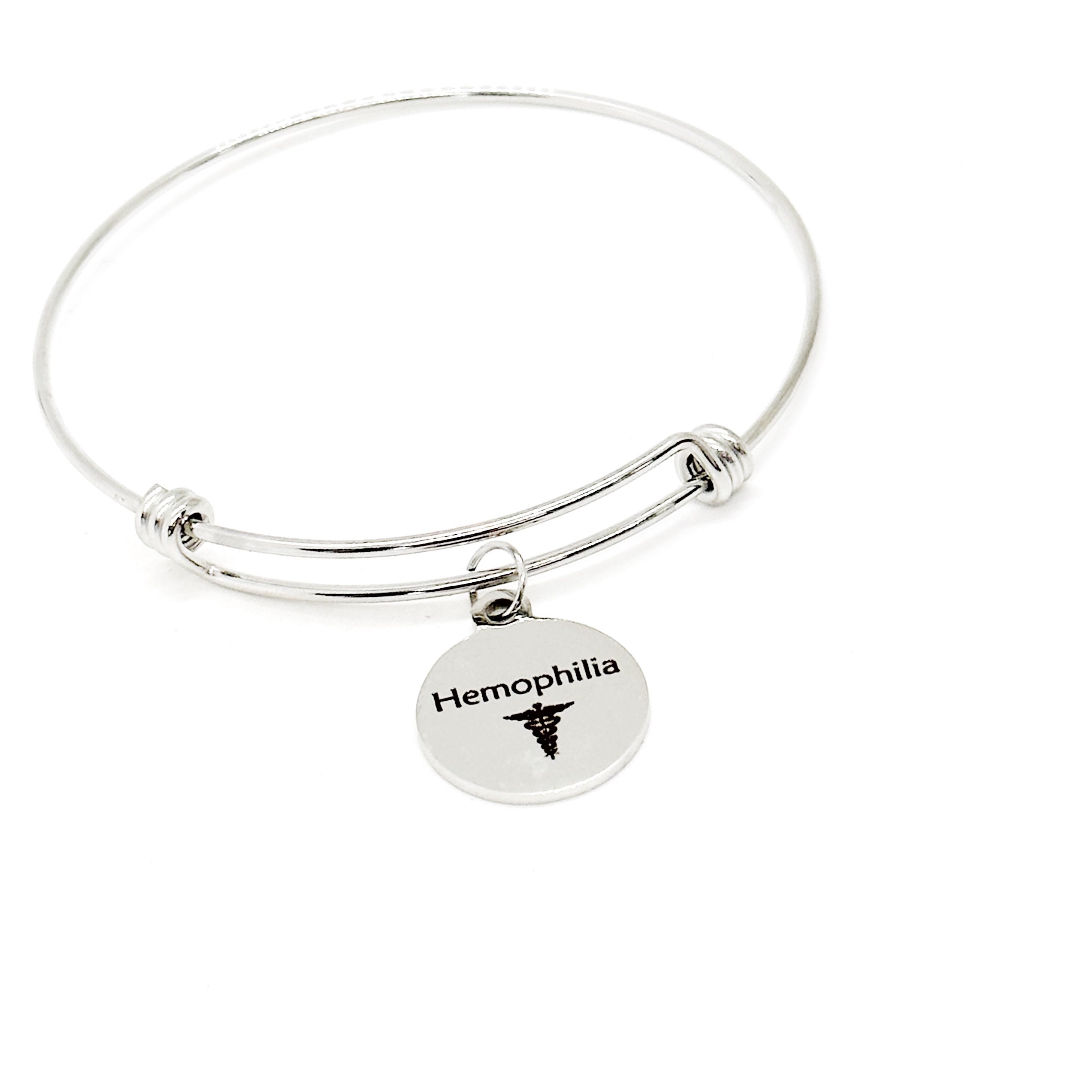 This is a beautiful bangle bracelet with a laser engraved stainless steel charm that has an “Hemophilia” notification on it.