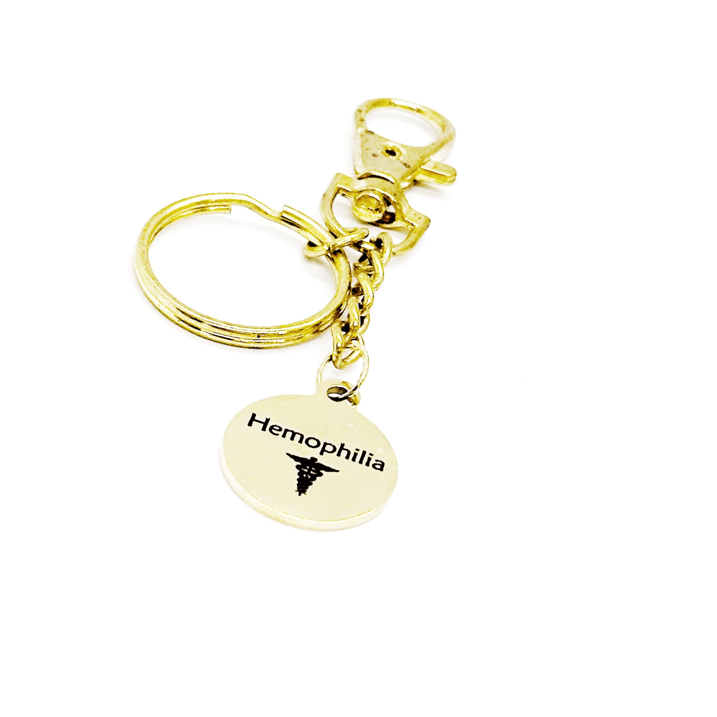 This is a great keychain gift and medical notification. The keyring can be clipped onto your bag to make it easy to access without digging to the bottom of the bag. It has a gold-plated stainless steel laser engraved charm with “Hemophilia" with a medical caduceus on it.