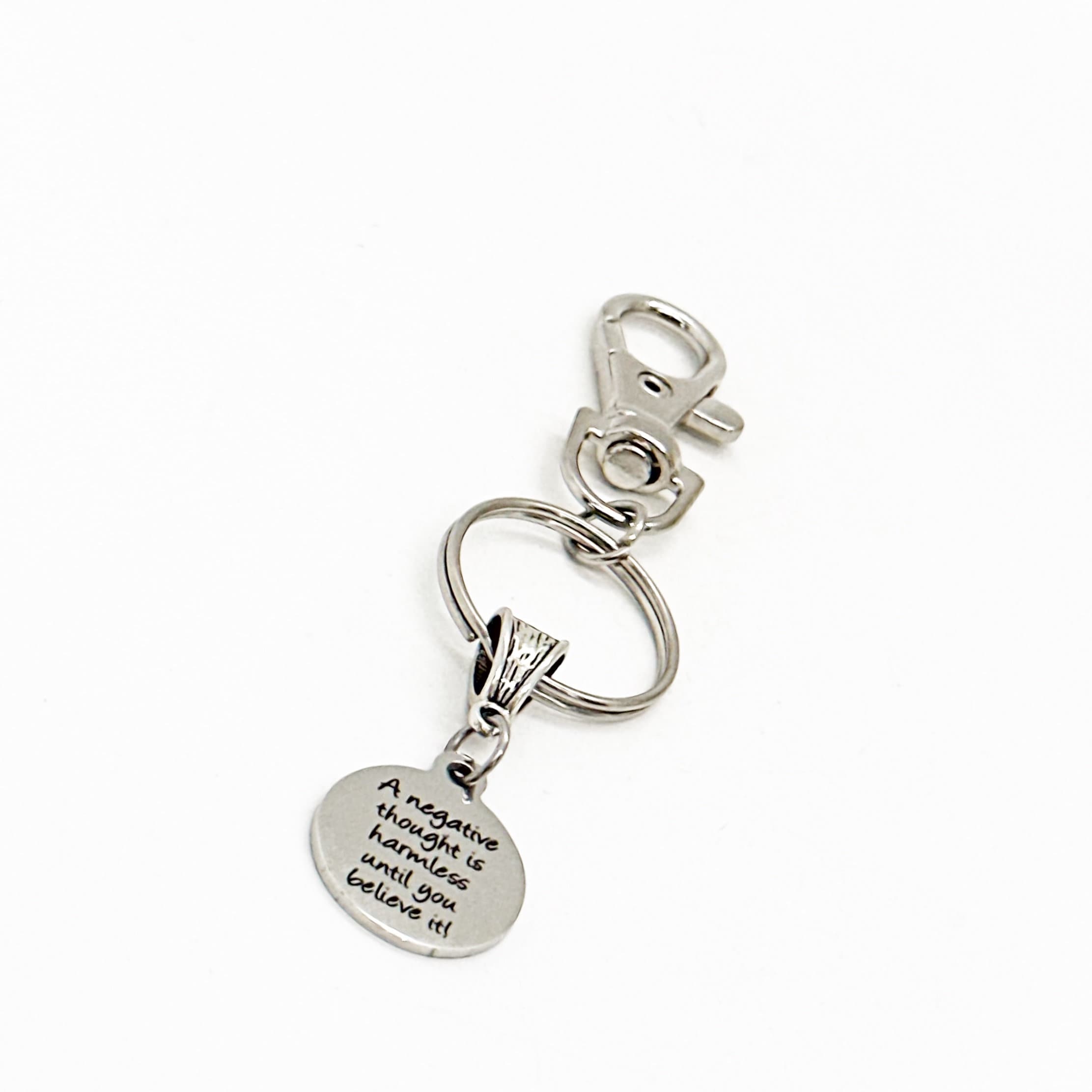 This is a great keychain gift . The keyring can be clipped onto your bag to make it easy to access without digging to the bottom of the bag. It has an engraved charm with “A negative thought is harmless until you believe it” on it. The charm measures approx. 3/4 inch across.