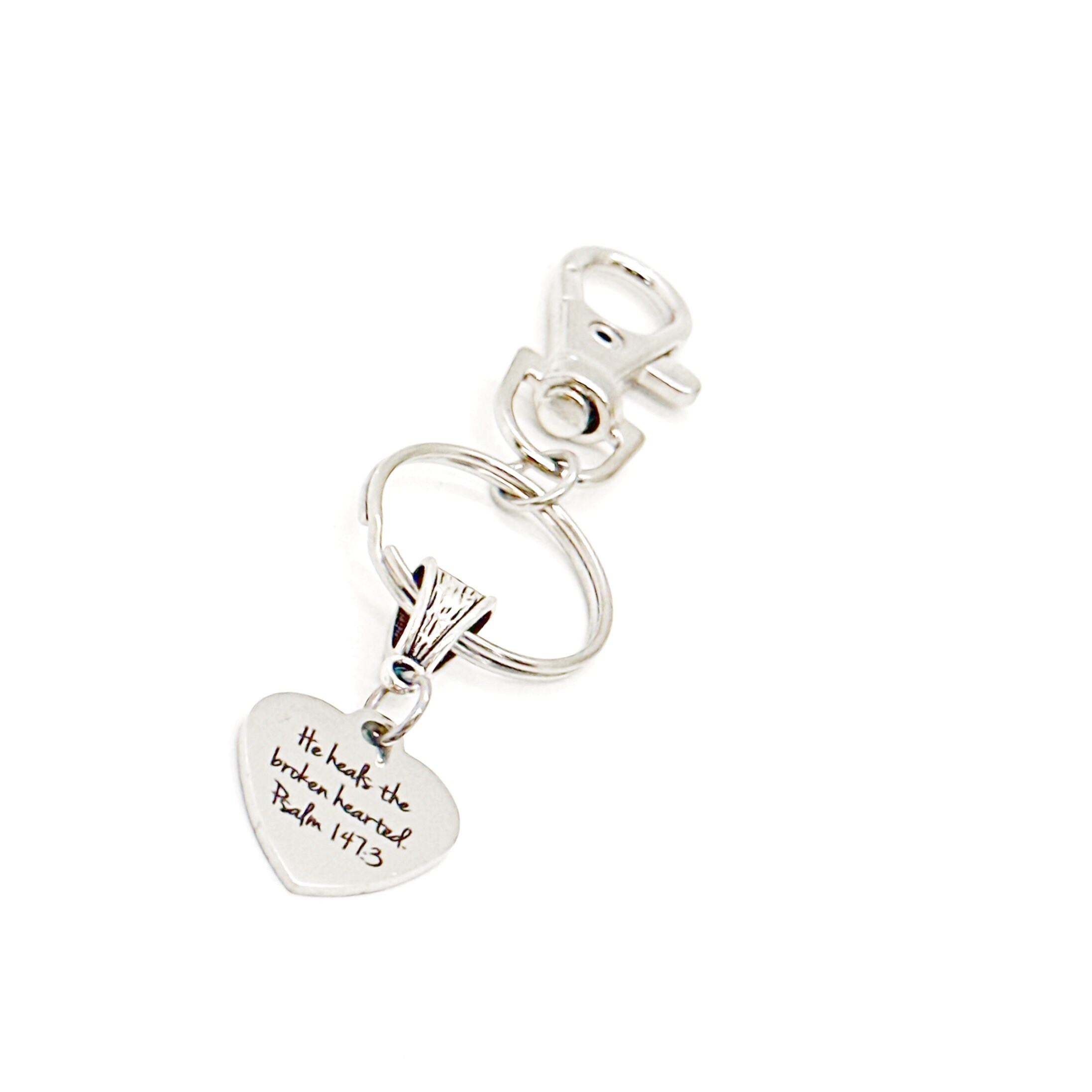 This is a great keychain gift . The keyring can be clipped onto your bag to make it easy to access without digging to the bottom of the bag. It has an engraved charm with “He heals the broken hearted” from Psalm 147:3 on it. The charm measures approx. 3/4 inch across.