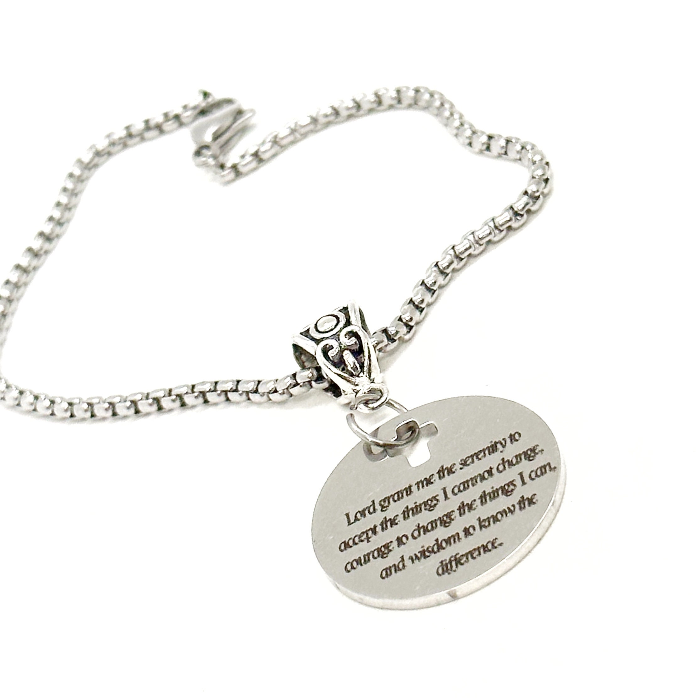 This is a beautiful bracelet with a laser engraved stainless steel charm that has the Serenity Prayer on a silvertone European bail. The engraved charm measures approx. 1 inch across.