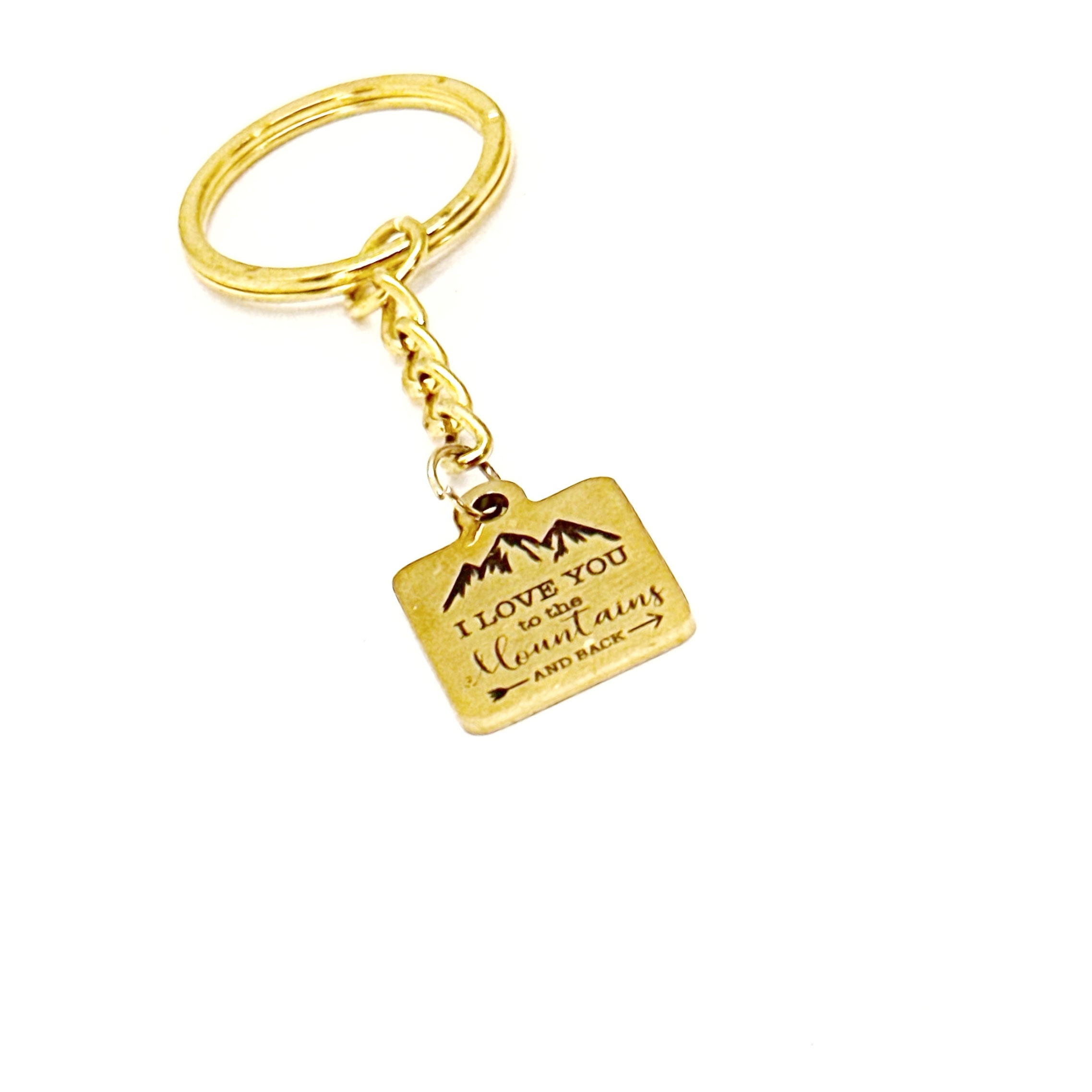 This is a wonderful keychain gift! It has a gold-plated stainless steel laser engraved charm with “I love you to the mountains and back” on it. The charm measures approx. 1/2 inch across.
