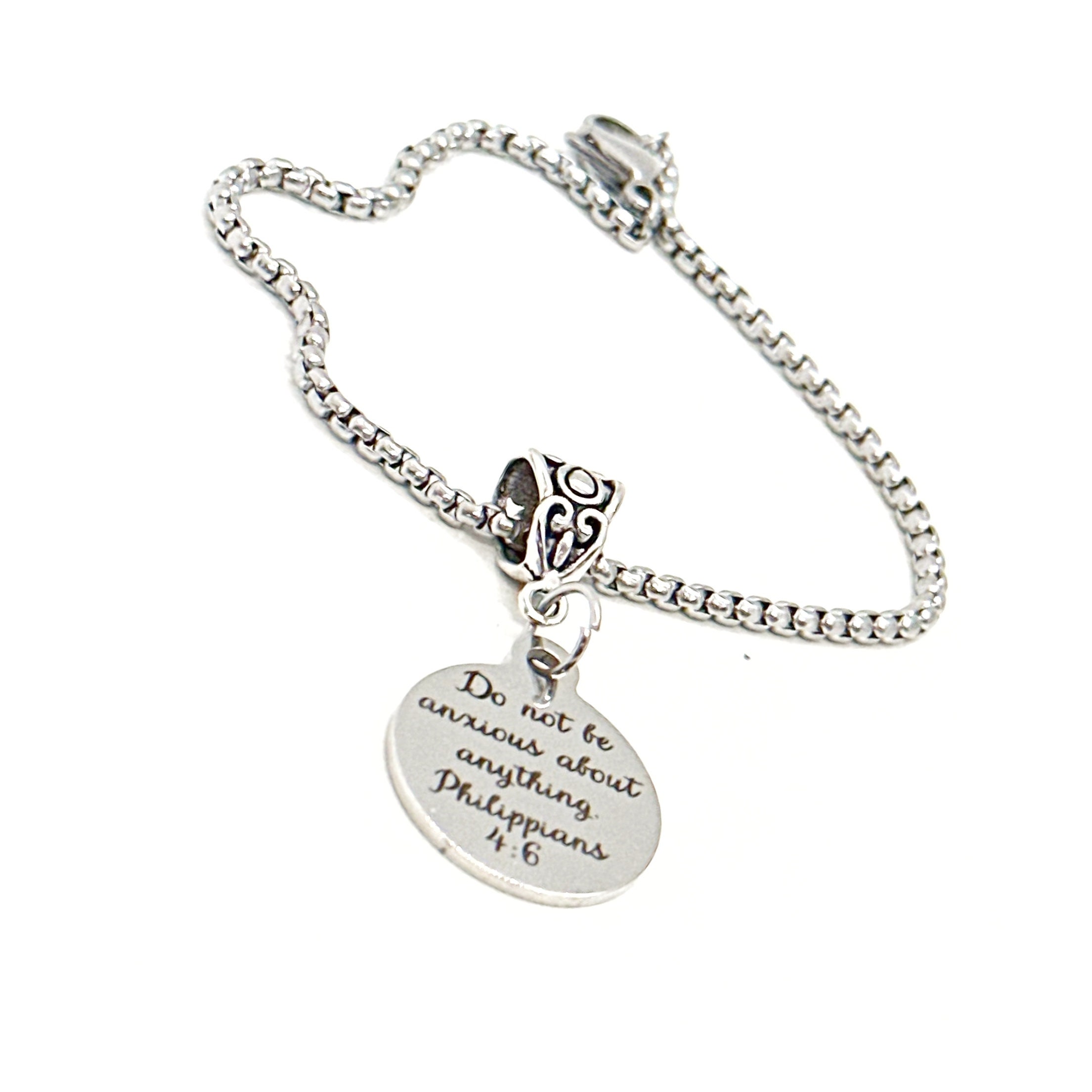 This is a beautiful bracelet with a laser engraved stainless steel charm that has “Do not be anxious about anything” from Philippians 4:6 on it with a silvertone bail. The charm measures approx. 3/4 inch across.