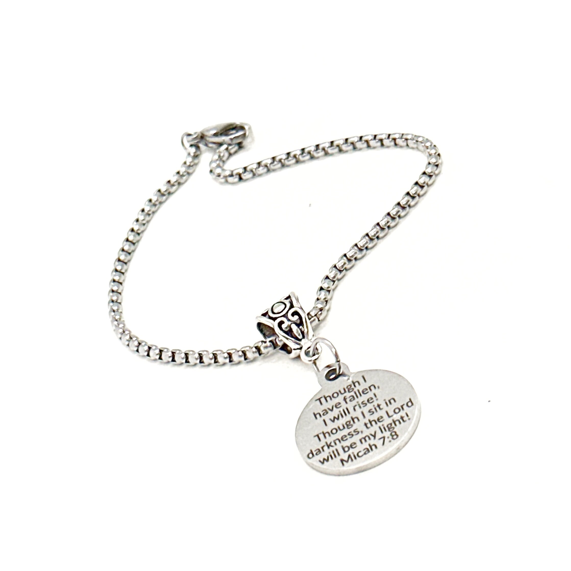 This is a beautiful bracelet with a laser engraved stainless steel charm that has “Though I have fallen, I will rise! Though I sit in darkness, the Lord will be my light!” from Micah 7:8 on it with a silvertone bail. The charm measures approx. 3/4 inch across.
