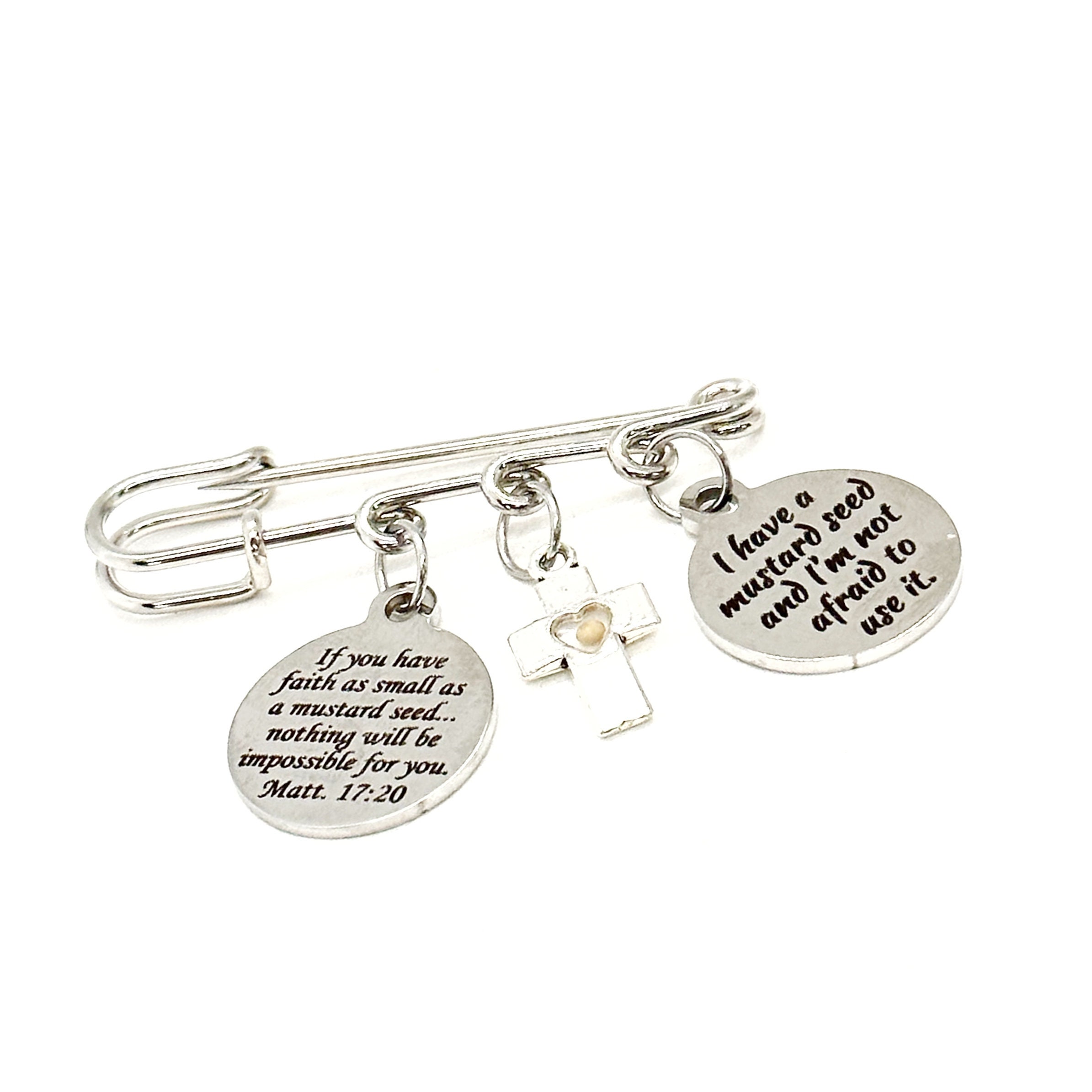 This is a 2 inch, 3 charm pin or brooch. The pin includes laser engraved stainless steel charms with “I have a mustard seed and I’m not afraid to use it” and “If you have faith as small as a mustard seed… nothing will be impossible for you. Matt. 17:20” and a small silvertone cross with a single mustard seed at the center. Each charm measures approx. 3/4 inch across. The engraving is front side only. If back-side engraving is needed, it is available for an additional charge. Please contact me prior to ordering.