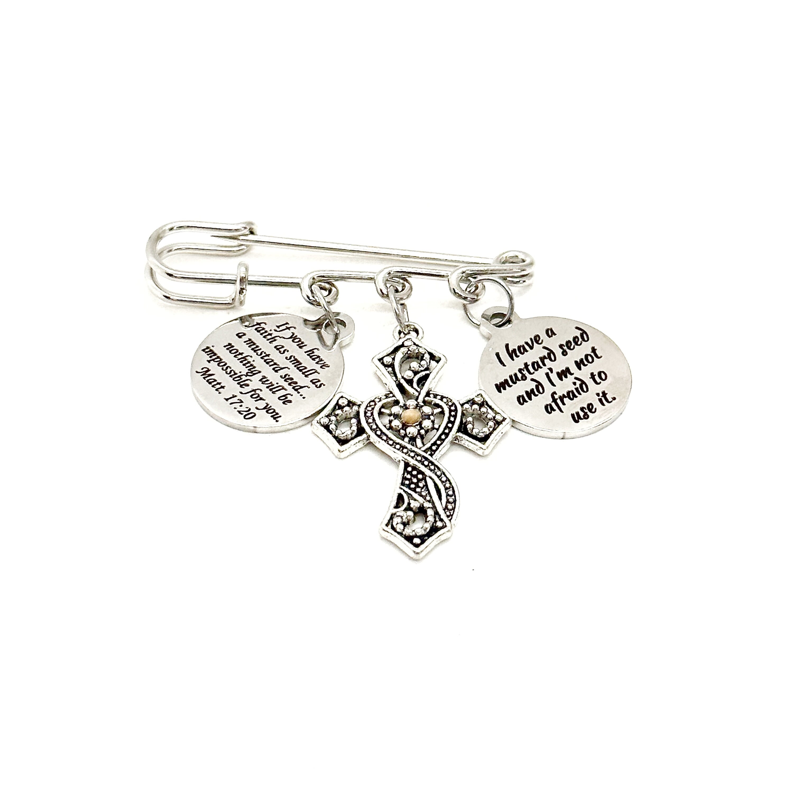 This is a 2 inch, 3 charm pin or brooch. The pin includes laser engraved stainless steel charms with “I have a mustard seed and I’m not afraid to use it” and “If you have faith as small as a mustard seed… nothing will be impossible for you. Matt. 17:20” and a silvertone cross with a single mustard seed at the center. Each charm measures approx. 3/4 inch across. The engraving is front side only. If back-side engraving is needed, it is available for an additional charge. Please contact me prior to ordering.