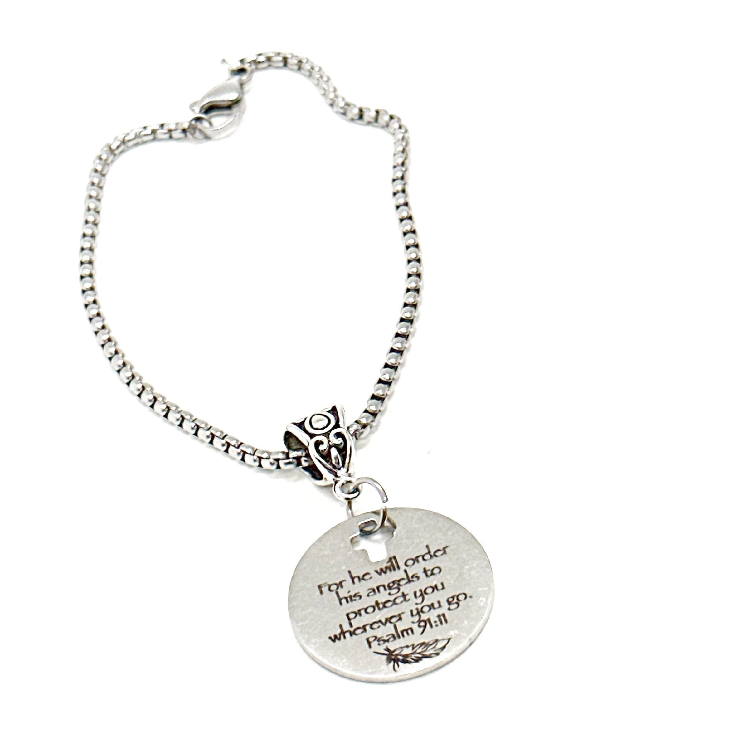 This is a beautiful bracelet with a laser engraved stainless steel charm that has “For he will order his angels to protect you wherever you go” from Psalm 91:11 on a silvertone bail. The engraved charm measures approx. 1 inch across.