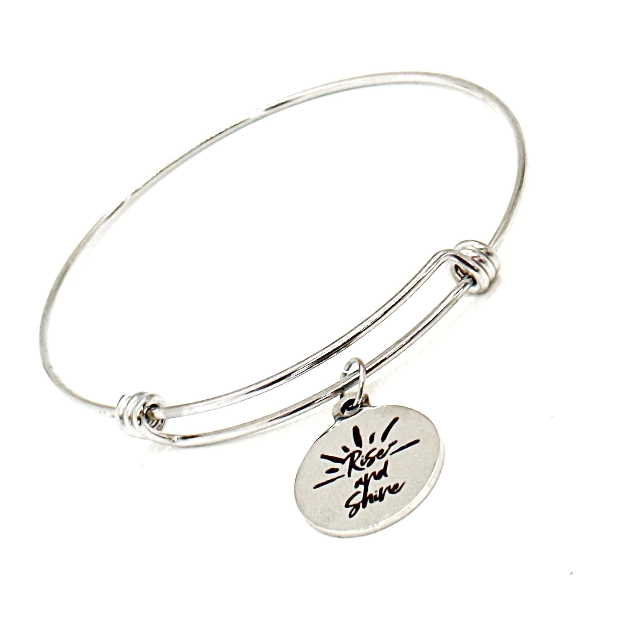 This is a beautiful bangle bracelet with a laser engraved stainless steel charm that has “Rise and Shine” on it.