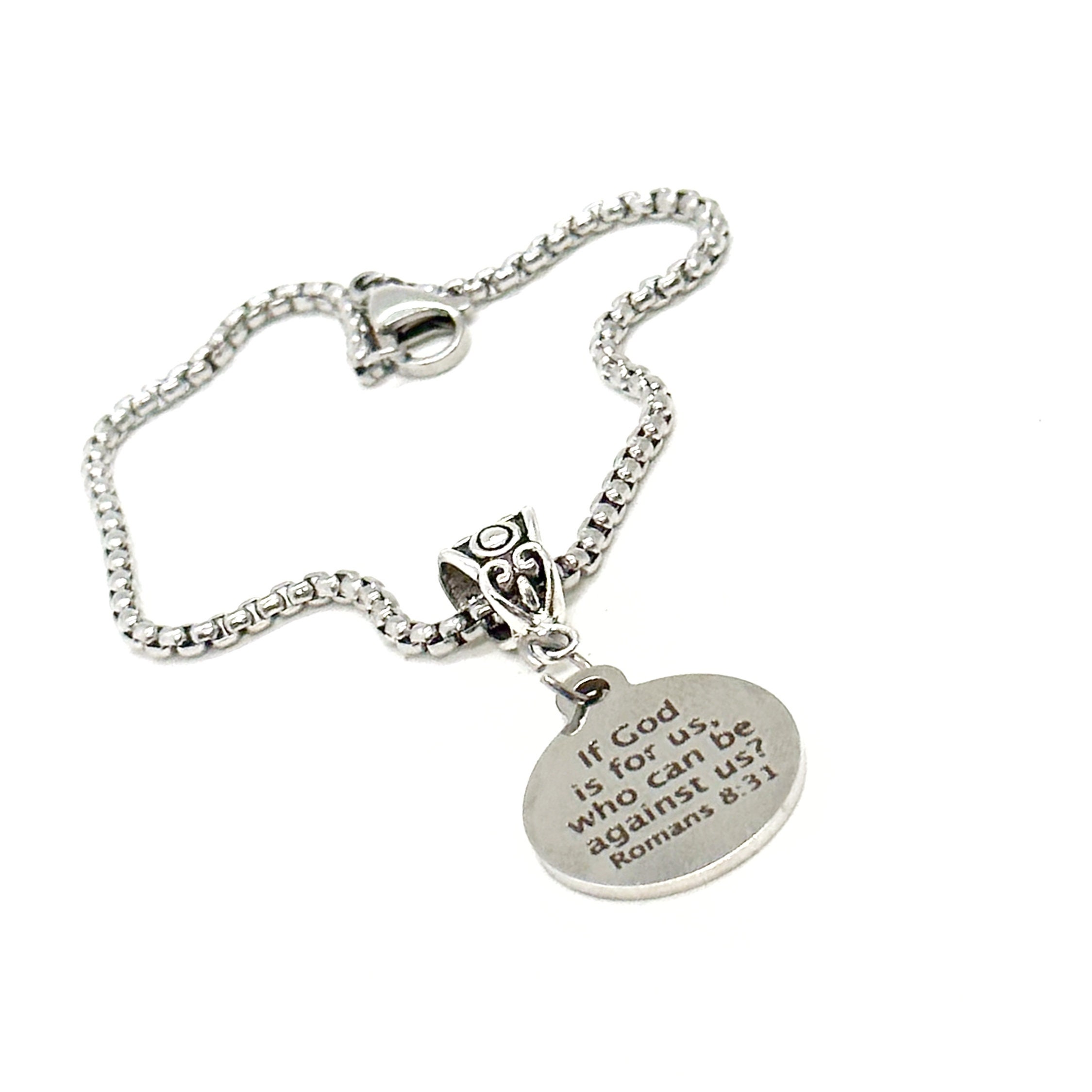 This is a beautiful bracelet with a stainless steel laser engraved charm with “If God is for us who can be against us” from Romans 8:31 on it on a silvertone European bail. The charm measures approx. 3/4 inch across.