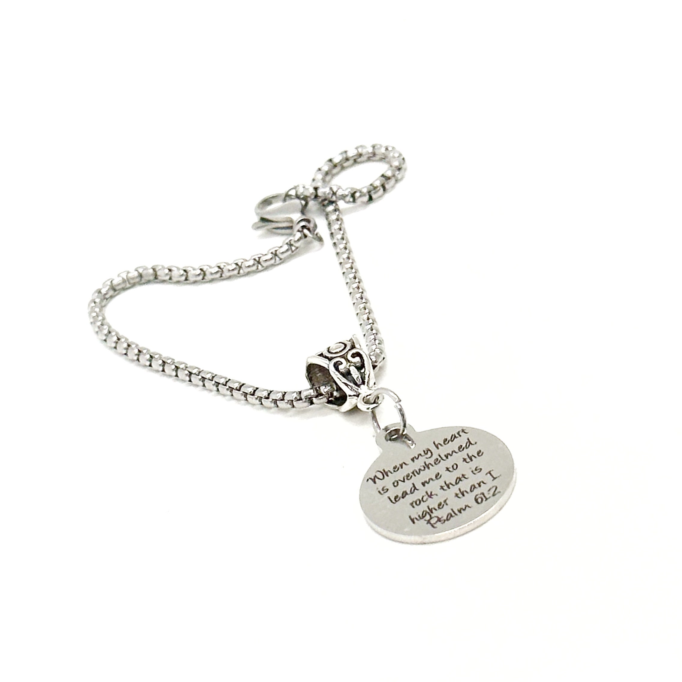 This is a beautiful bracelet with a stainless steel laser engraved charm with “When my heart is overwhelmed, lead me to the rock that is higher than I” from Psalm 61:2 on it on a silvertone European bail. The charm measures approx. 3/4 inch across.
