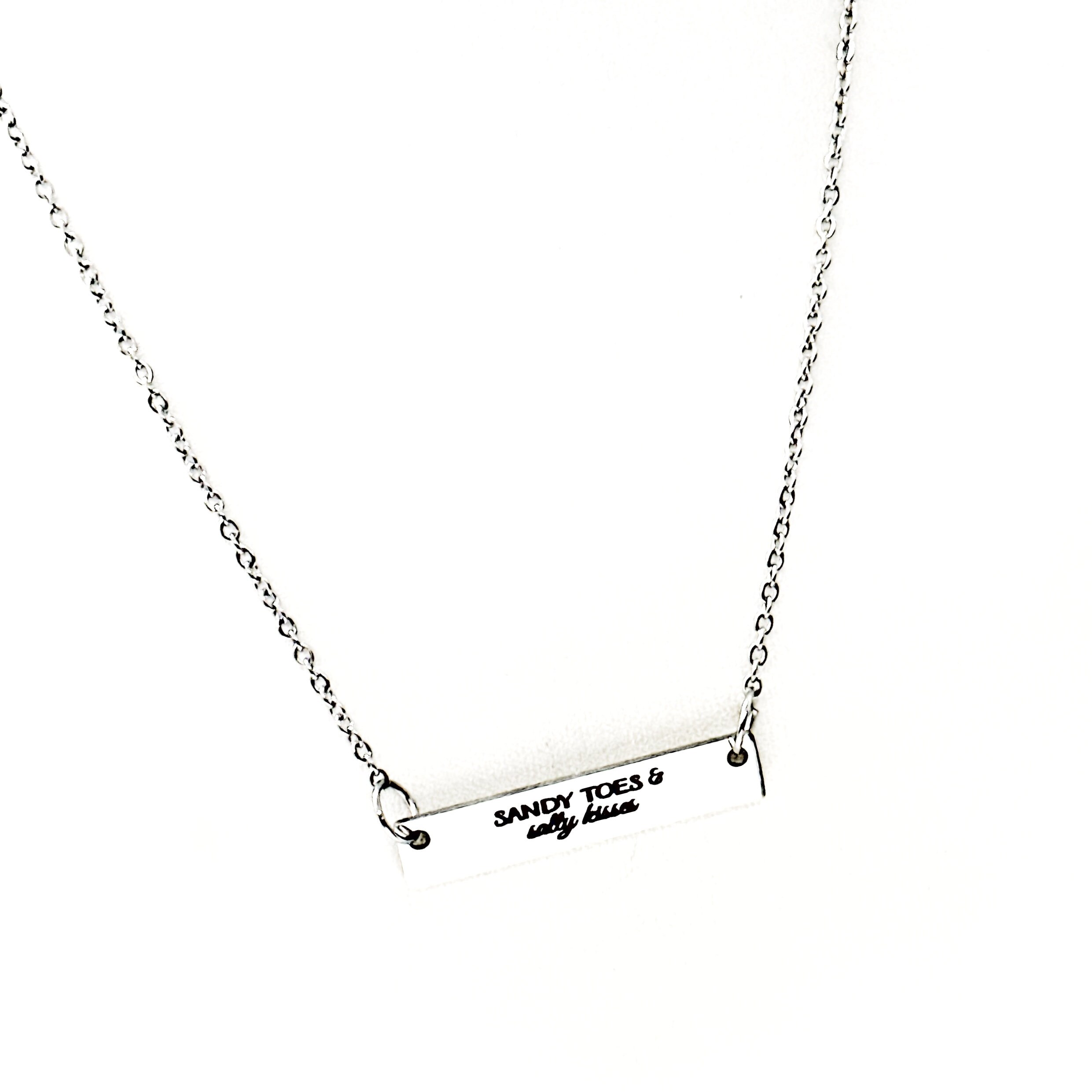 This is a beautiful stainless steel laser engraved “Sandy toes & salty kisses" connector bar pendant on a stainless steel chain necklace in your choice of lengths. It would also be a beautiful gift for someone you love!