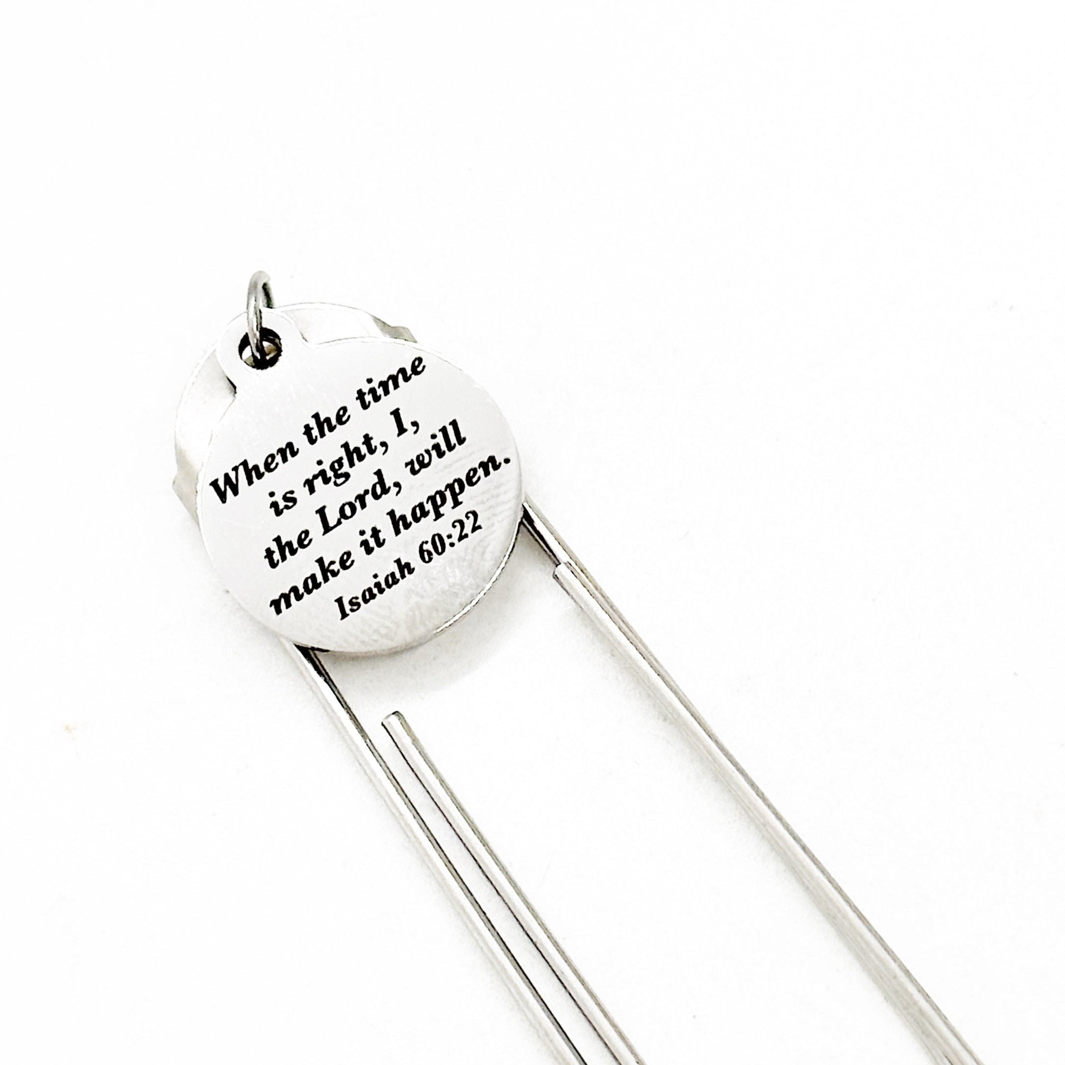 This is a great planner paper clip bookmark gift. This paper clip bookmark has an engraved charm with “When the time is right, I, the Lord will make it happen” from Isaiah 60:22 on it.