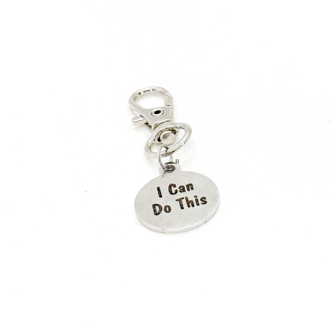 This is a great zipper pull or bag charm clip gift that would be a great gift. It would be a great charm to clip onto a tote, purse, sports bag, book bag or keychain. It has an engraved charm with “I can do this” on it.