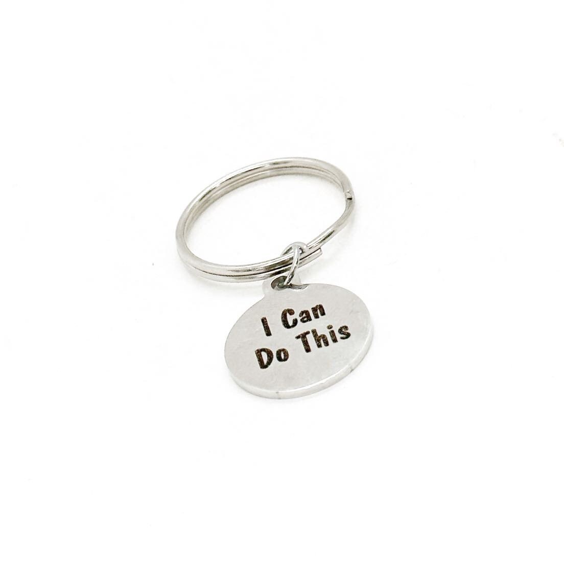 This is a wonderful keychain gift! It has a stainless steel laser engraved charm with “I can do this" on it. The charm measures approx. 3/4 inch across.