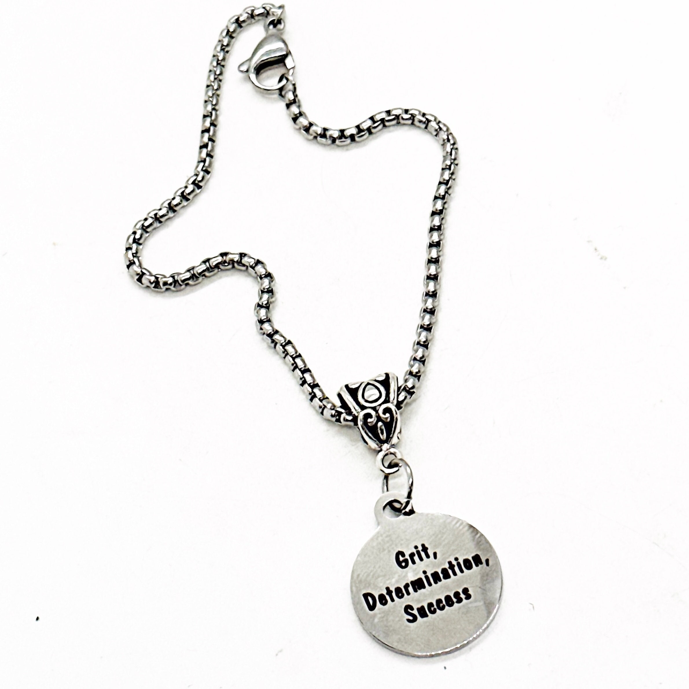 This is a beautiful bracelet with a stainless steel laser engraved charm with “Grit, Determination, Success” on it on a silvertone European bail. The charm measures approx. 3/4 inch across.