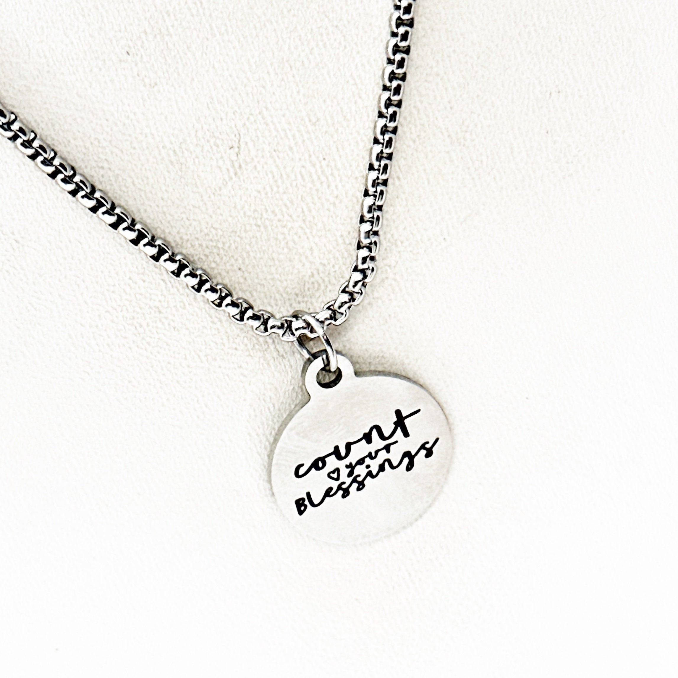 This necklace comes with an engraved charm pendant on a stainless steel box chain. The pendant is also available for individual purchase if you have another chain on which you would like to wear it. The pendant has “Count your blessings" on it. The pendant measures approx. 3/4 inch across.