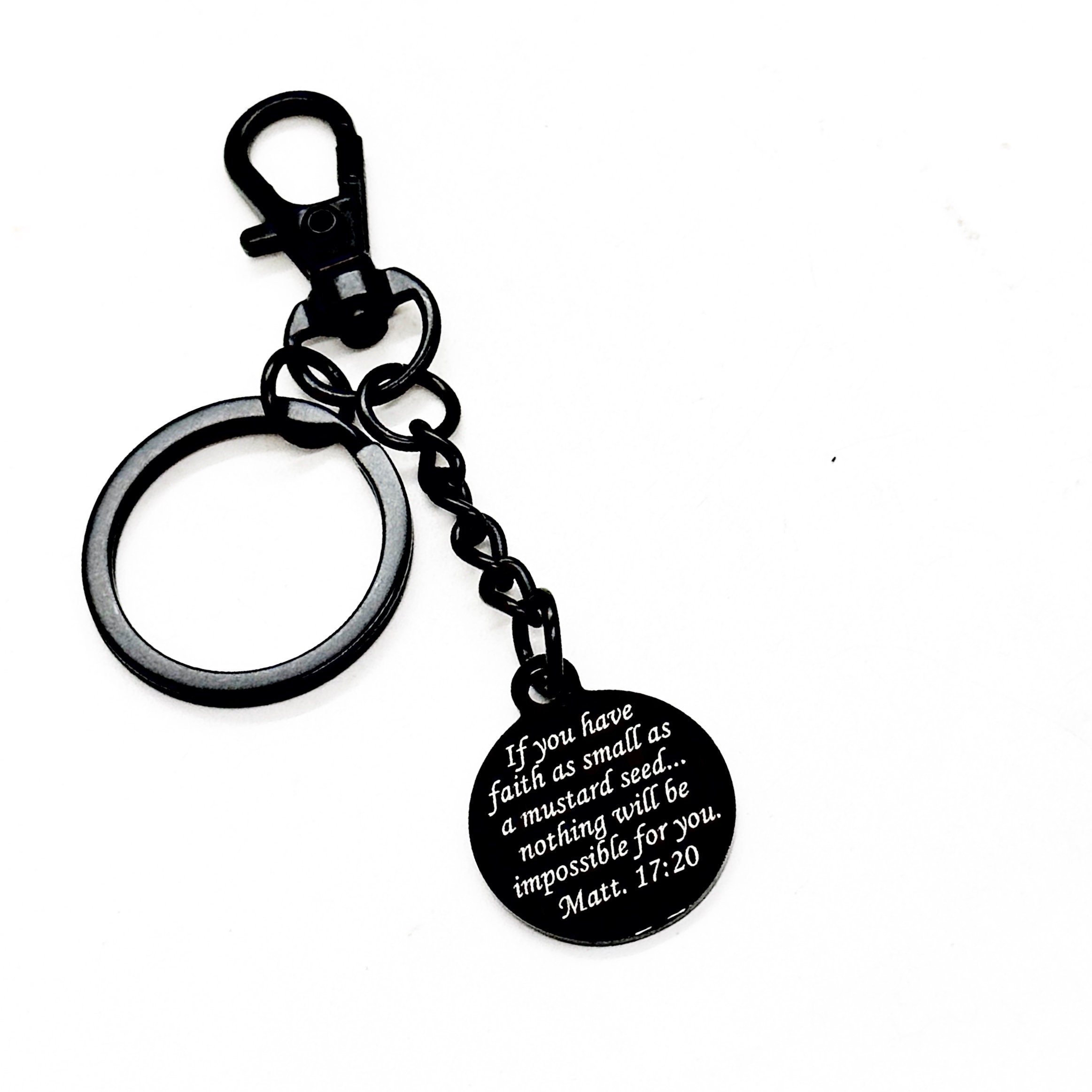 This is a great keychain gift of faith. It has a black engraved charm with the scripture of Matthew 17:20 that tells us that with faith as small as a mustard seed, we can move mountains. This keychain can be clipped to a bag to make them easier to find. The charm measures approx. 3/4 inch.