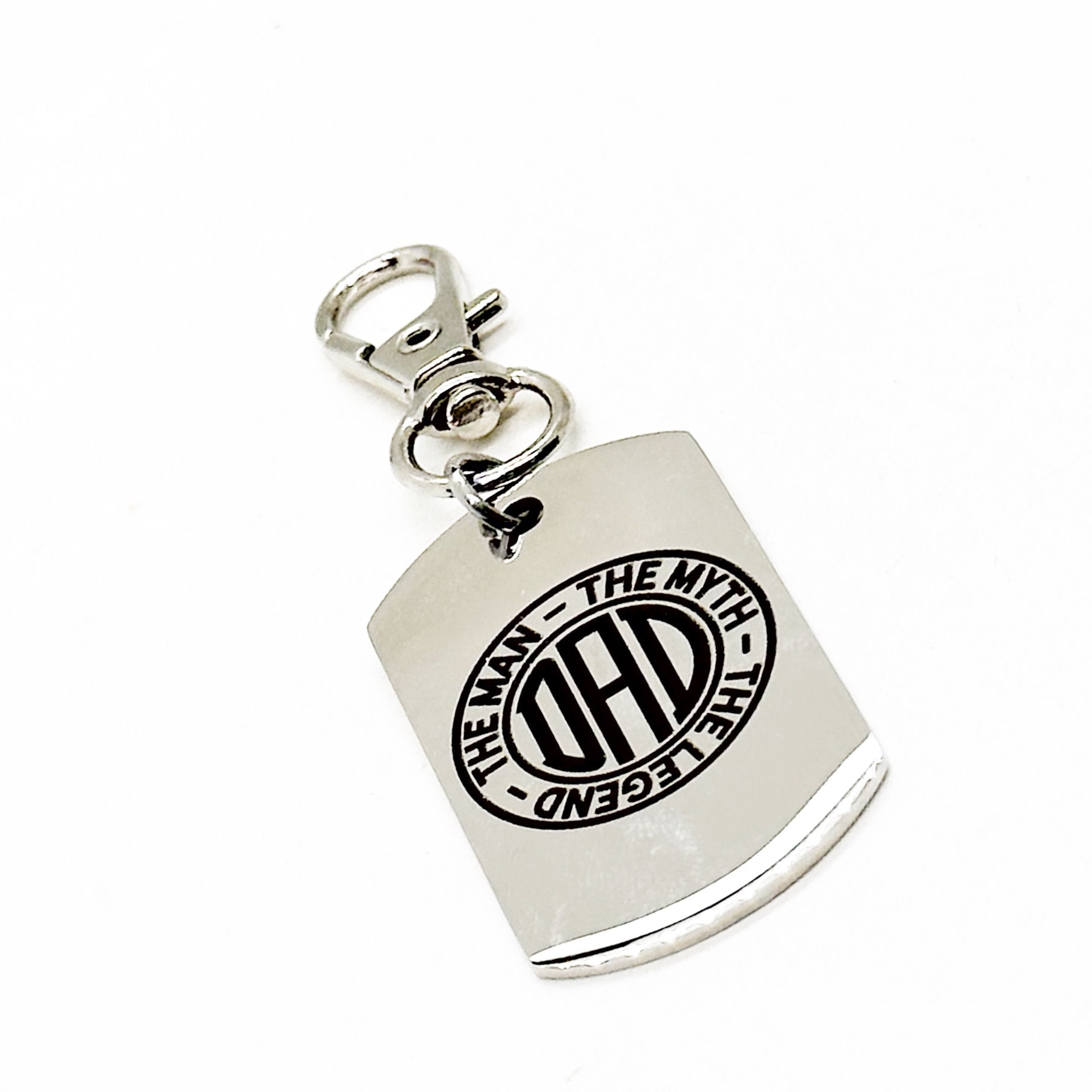 This is a great zipper pull or bag charm clip gift. It would also be a great charm to clip onto a tote, sports bag, book bag or keychain. It has a stainless steel laser engraved charm with “Dad The Man The Myth The Legend” on it.