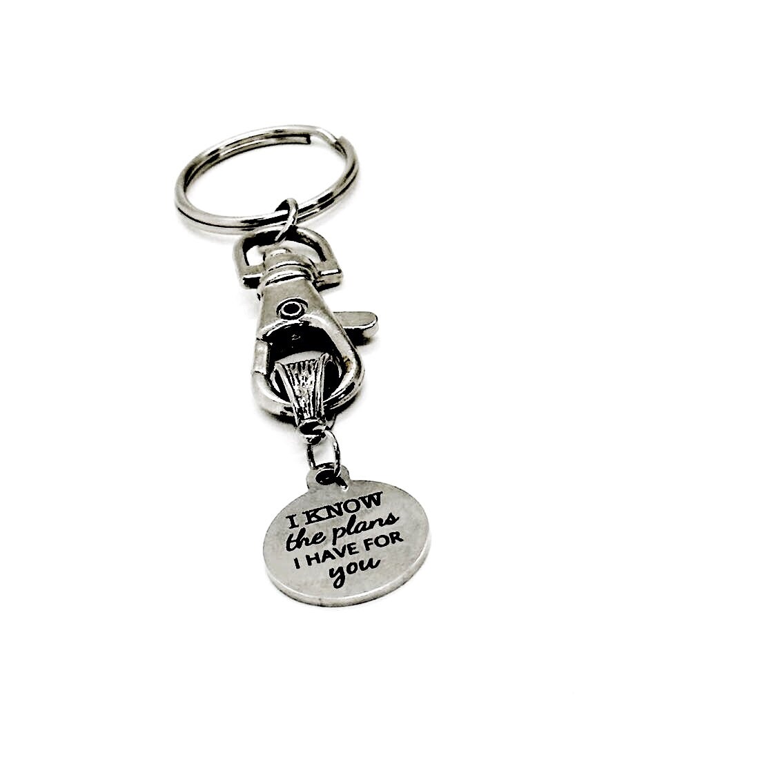 “I know the plans I have for you” on it. The charm measures approx. 3/4 inch across.