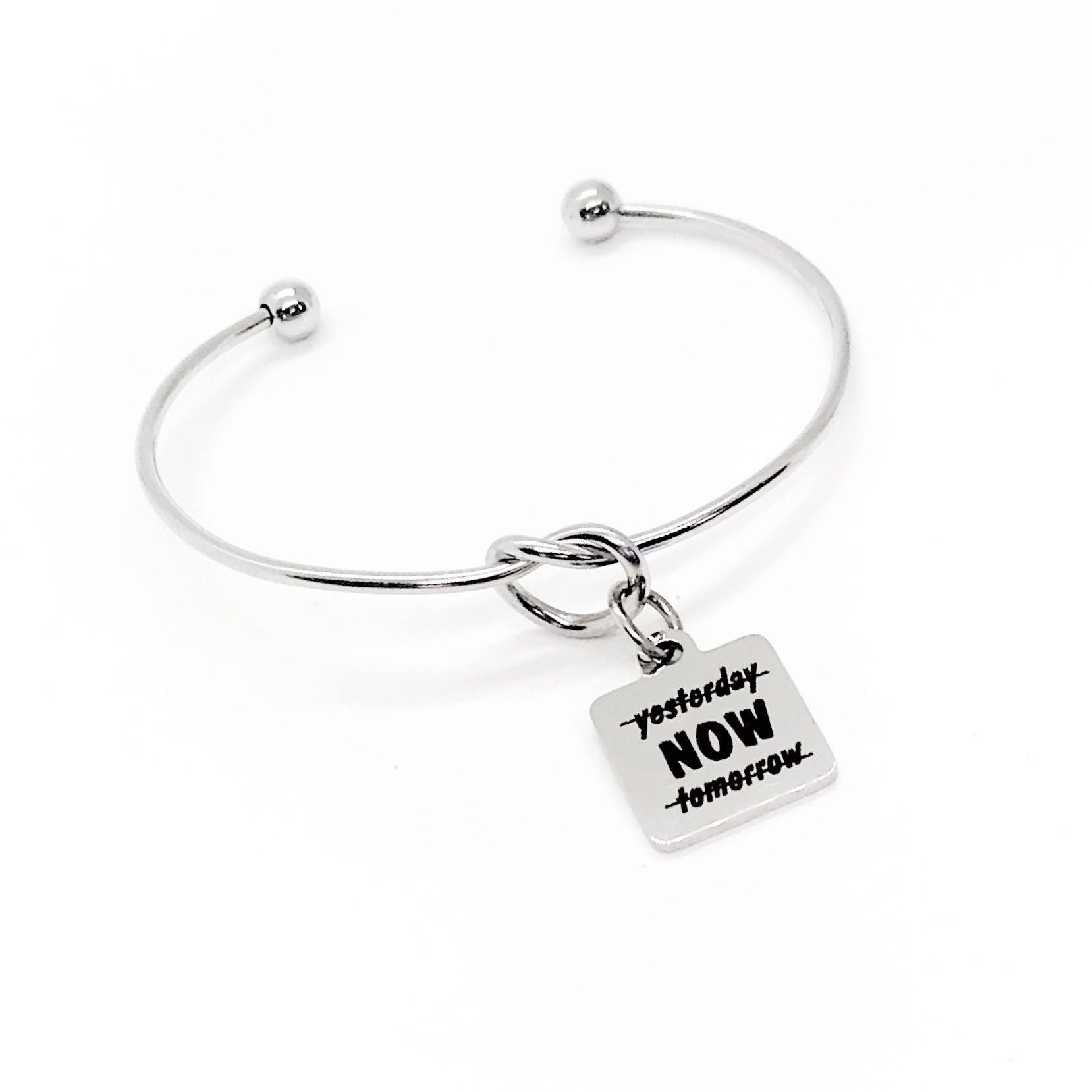 This is a beautiful knotted cuff bracelet with an engraved charm with ‘NOW” on it. The charm measures approx. 3/4 inch. The bracelet easily expands to fit on any wrist size.