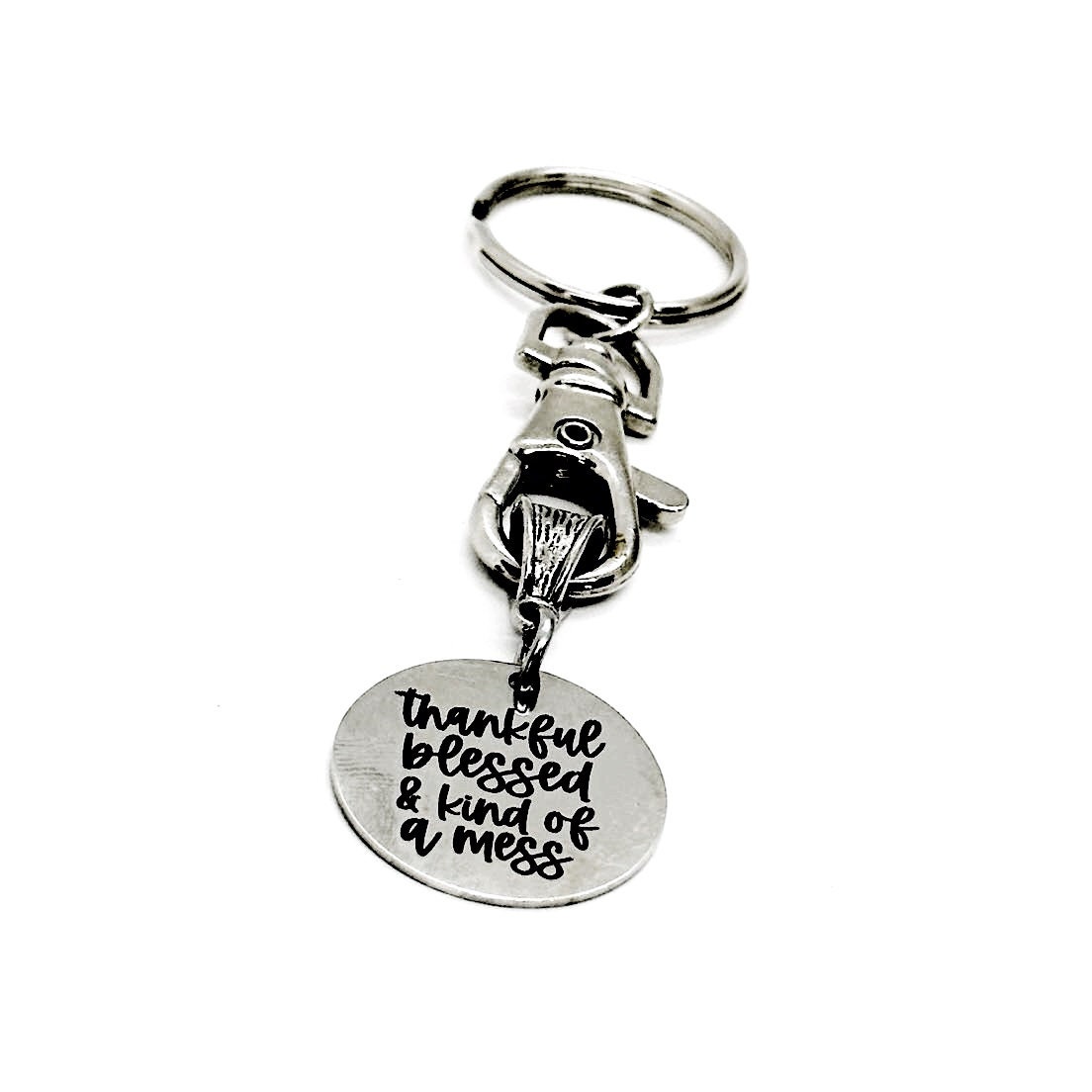 This keychain would make a a great gift. It has a stainless steel laser engraved charm with “thankful blessed and kind of a mess” on it. The charm measures approx. 1 inch across.