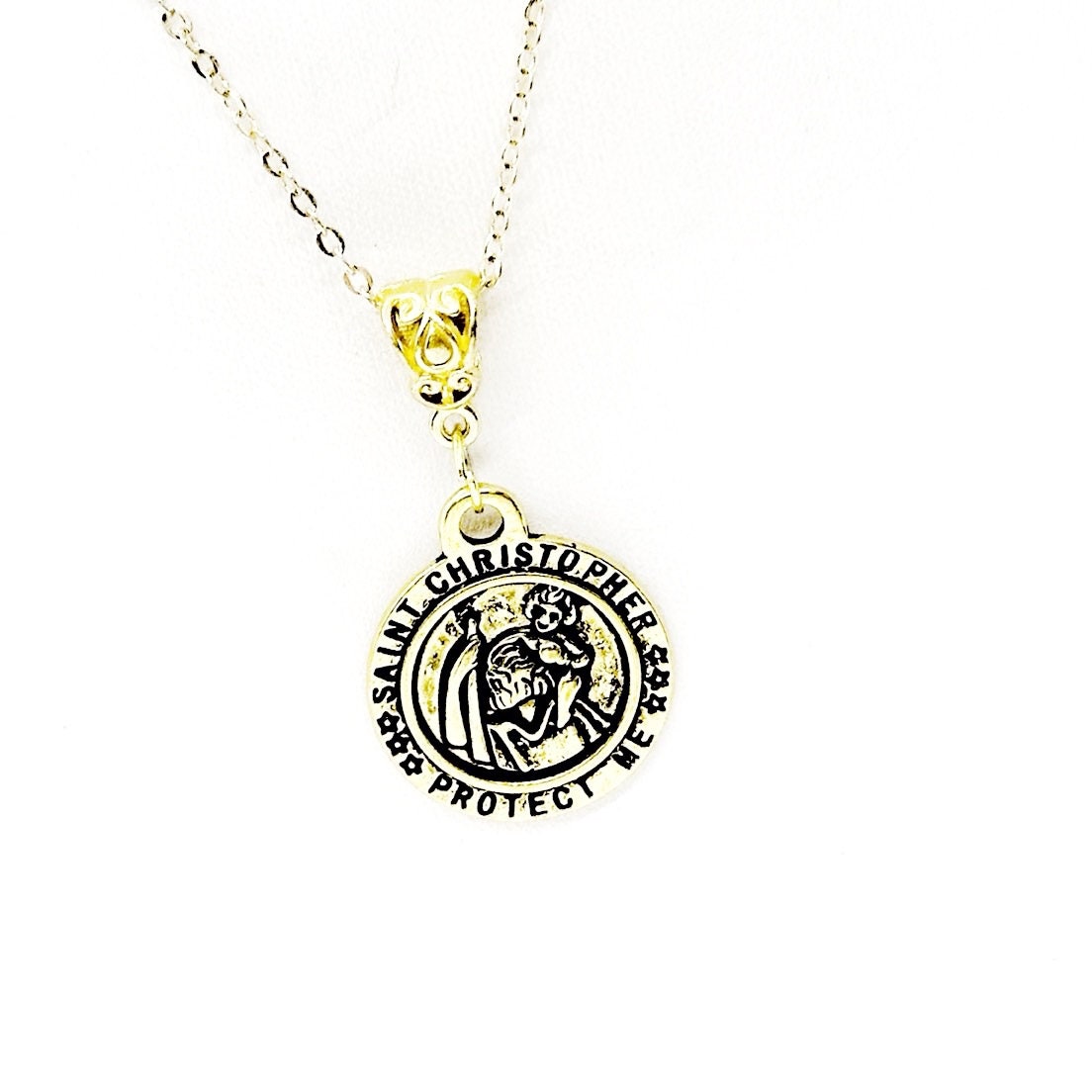 This is a goldtone Saint Christopher pendant on a gold-plated link chain. This pendant is available on your choice of 16, 18, 20, 22, 24, 26, 28 or 30 inch chain. The pendant is also available for individual purchase if you have another chain on which you would like to wear it. The charm measures approx. 1 inch across.