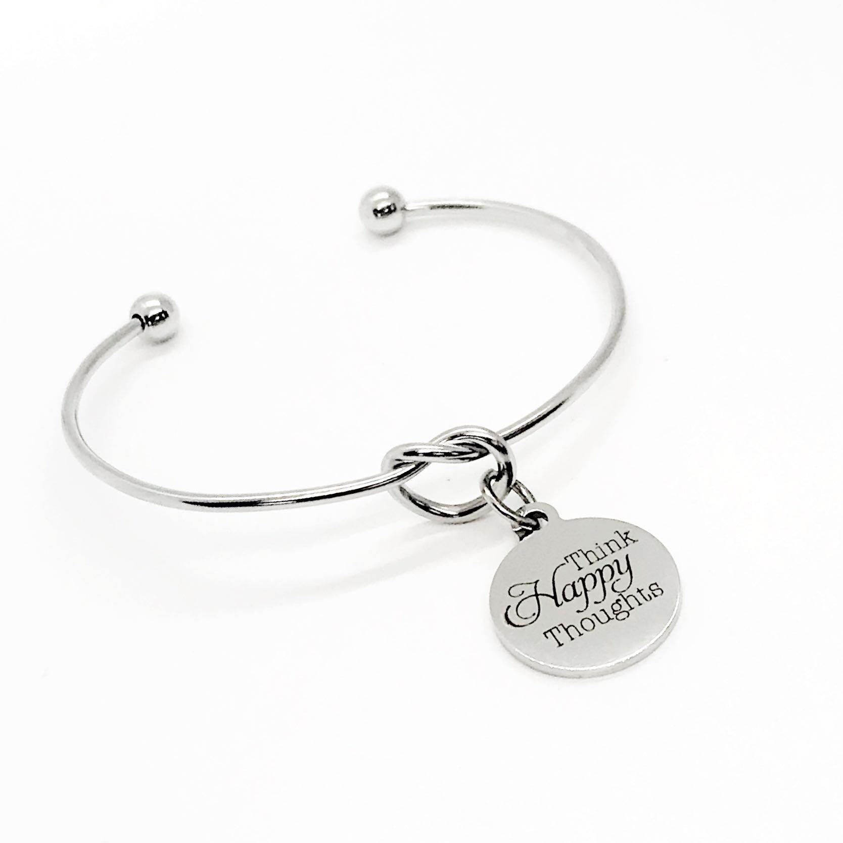 This is a beautiful knotted cuff bracelet with an engraved charm with ‘Think happy thoughts” on it. The charm measures approx. 3/4 inch. The bracelet easily expands to fit on any wrist size.