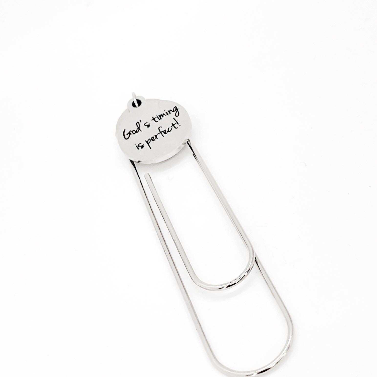 This is a great large paper clip style bookmark that has a stainless steel laser engraved charm with “God’s timing is perfect" on it. It can be used as a bookmark, page marker, or planner book mark.