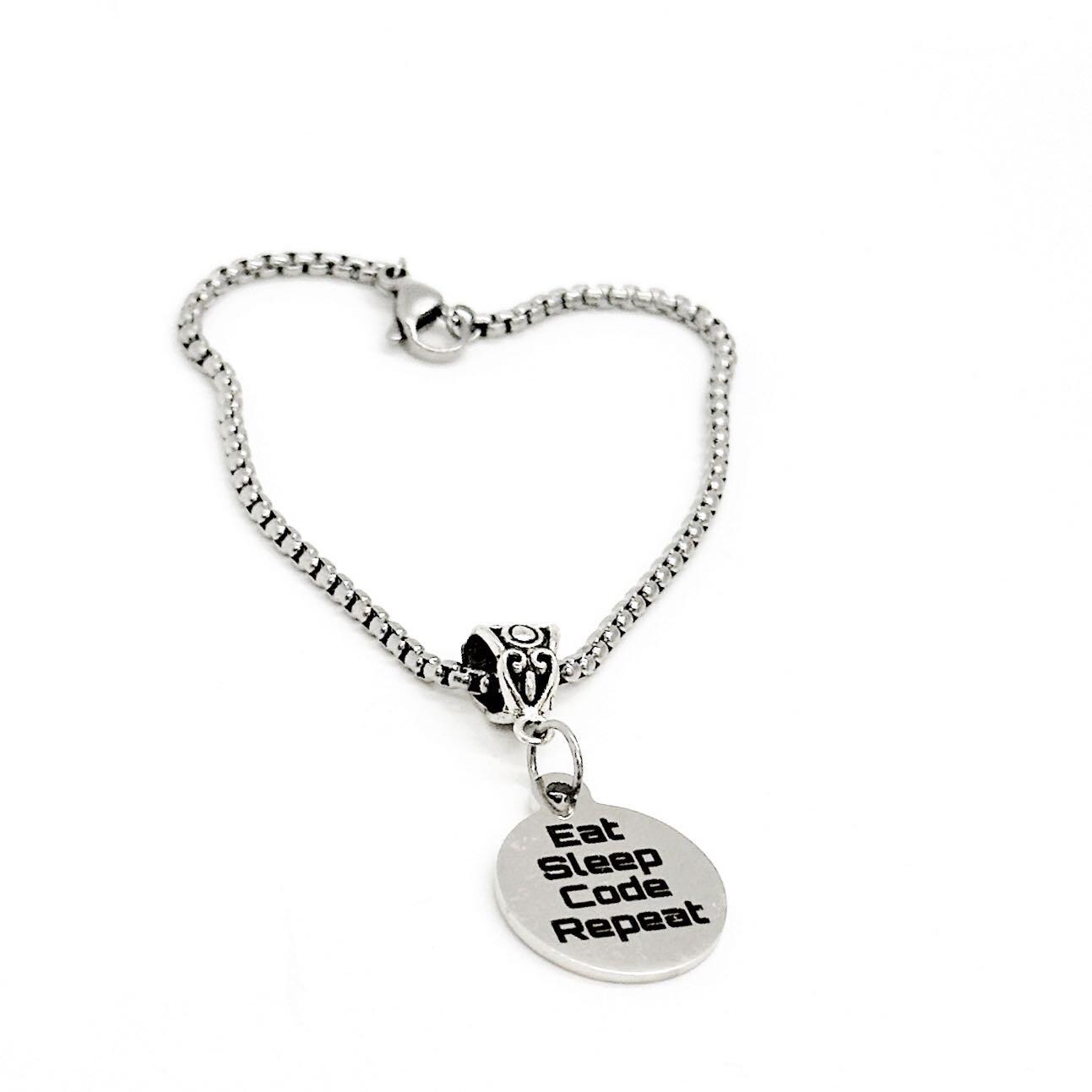 This is a beautiful bracelet with a stainless steel laser engraved charm with “Eat Sleep Code Repeat” on it on a silvertone European bail. The charm measures approx. 3/4 inch across.
