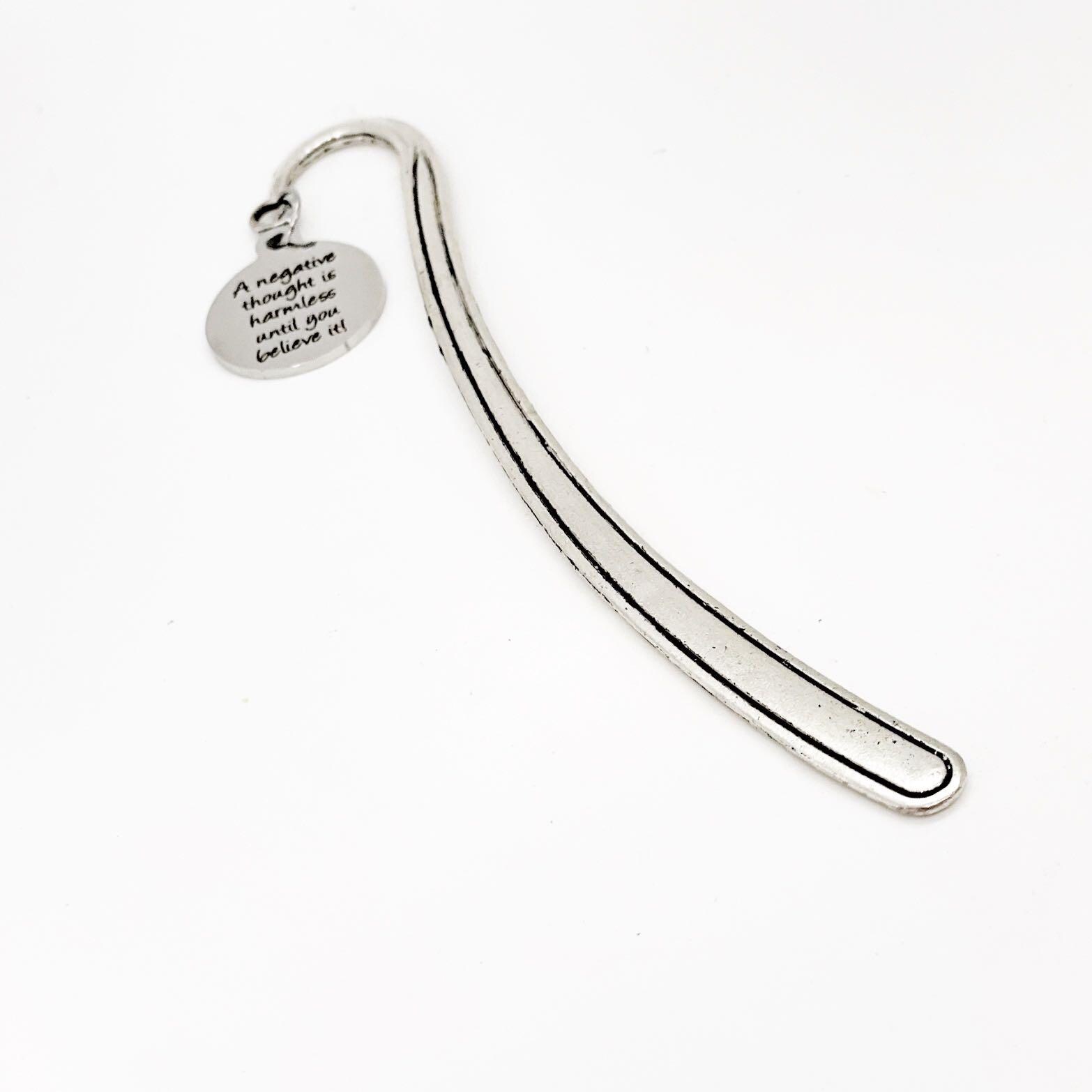 This is a great reader gift or planner bookmark! It is a metal bookmark that has a stainless steel laser engraved charm that has "A negative thought is harmless until you believe it" on it. The bookmark measures approx. 4.9 Inches in length. The charm measures approx. 3/4 inch.