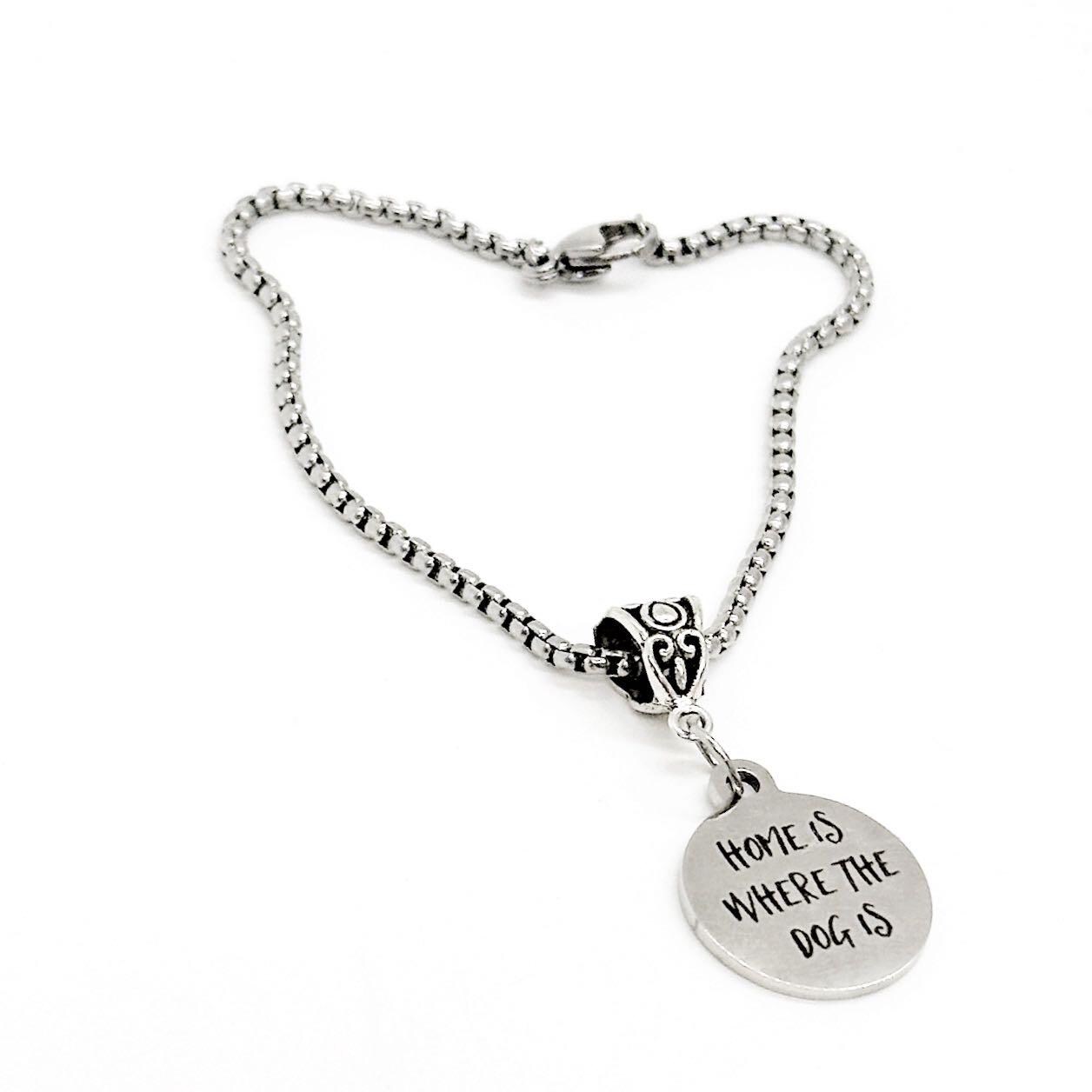 This is a beautiful bracelet with a stainless steel laser engraved charm with “Home Is Where The Dog Is” on it on a silvertone European bail. The charm measures approx. 3/4 inch across.