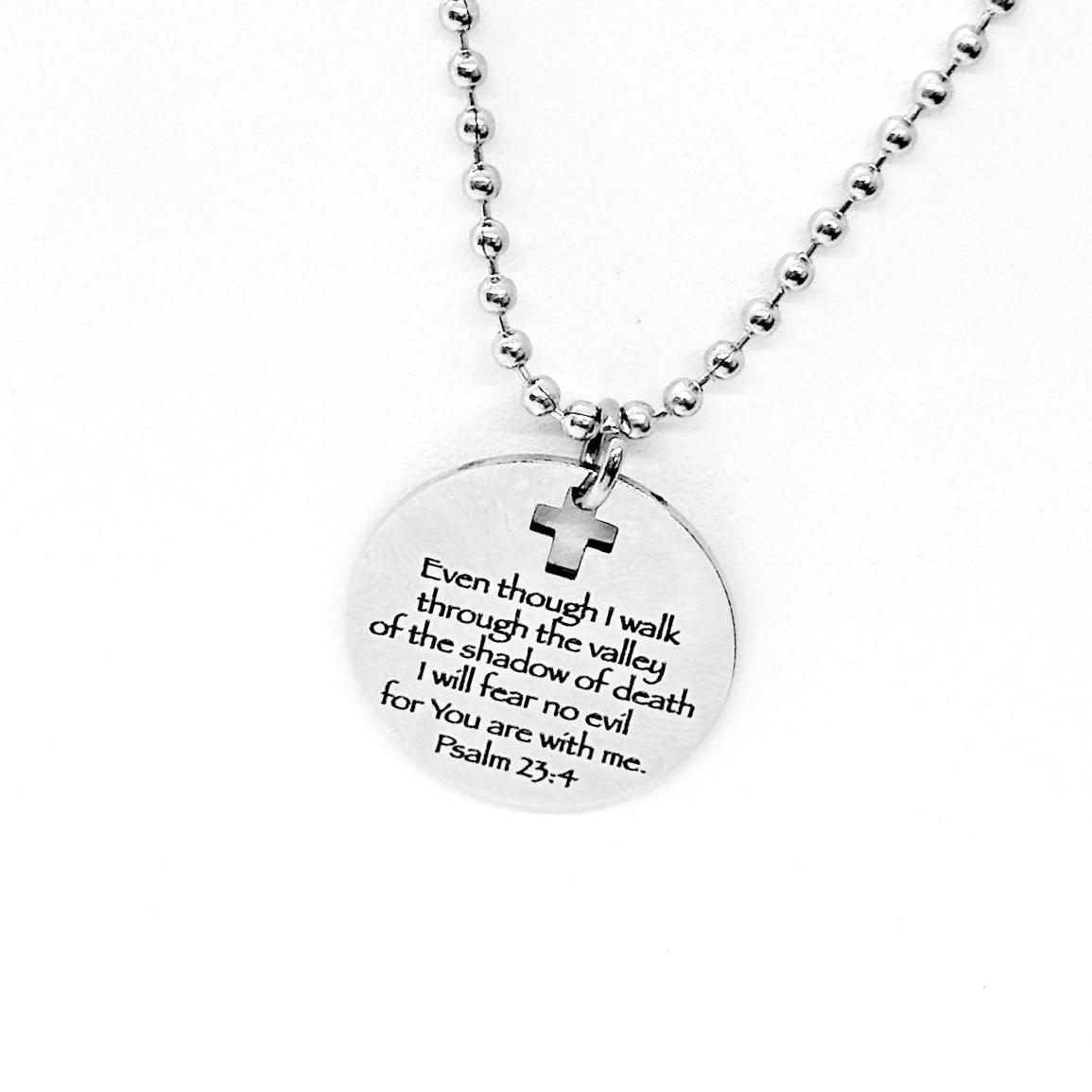 The is a beautiful jewelry piece that has a stainless steel laser engraved charm with “Even though I walk through the valley of the shadow of death, I will fear not evil for You are with me” from Psalm 23:4 on it. The charm measures approx. 3/4 inch across.