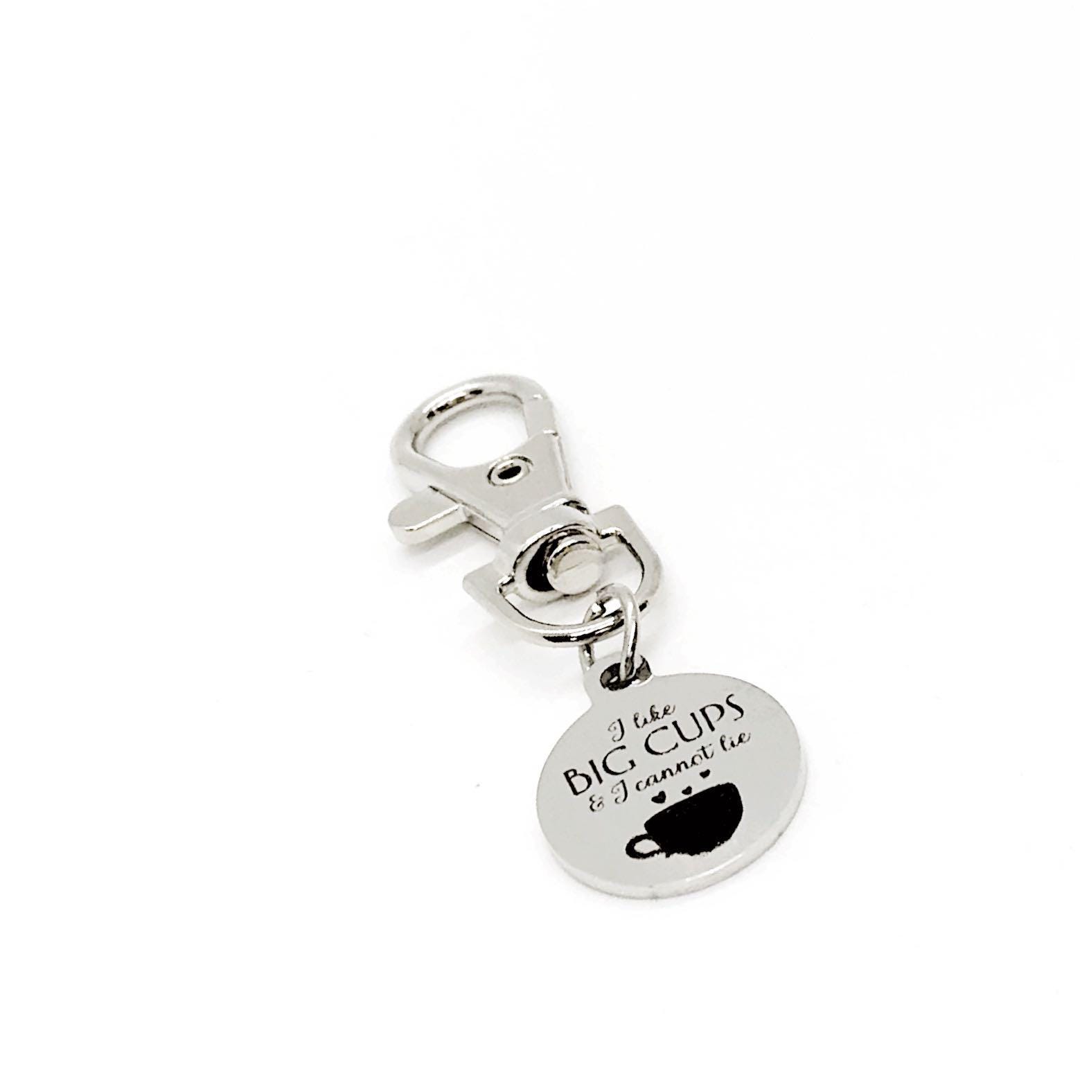 This is a great clip on charm or zipper pull which includes a stainless steel laser engraved charm with “I like big cups and I cannot lie” on it. The charm measures approx. 3/4 inch across.