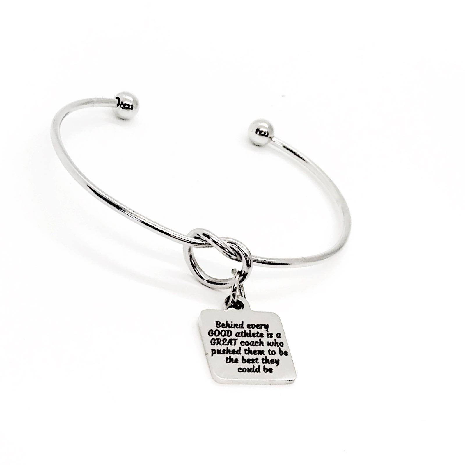 This is a beautiful knotted cuff bracelet with an engraved charm with “Behind every GOOD athlete is a GREAT coach who pushed them to be the best they could be” on it. The charm measures approx. 3/4 inch. The bracelet easily expands to fit on any wrist size.