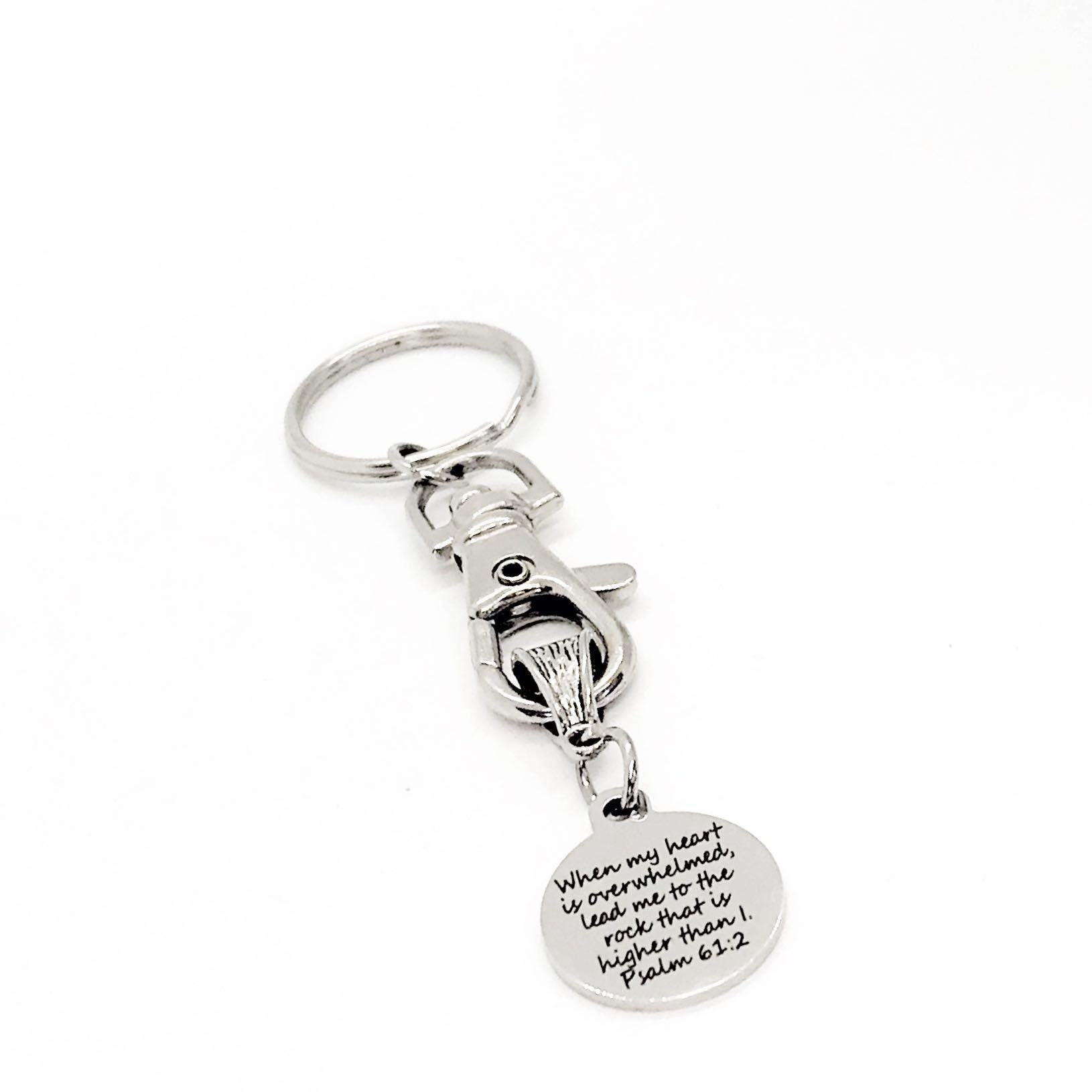 This keychain would make a great gift. It has a stainless steel laser engraved charm with “When my heart is overwhelmed, lead me to the rock that is higher than I” from Psalm 61:2 on it.