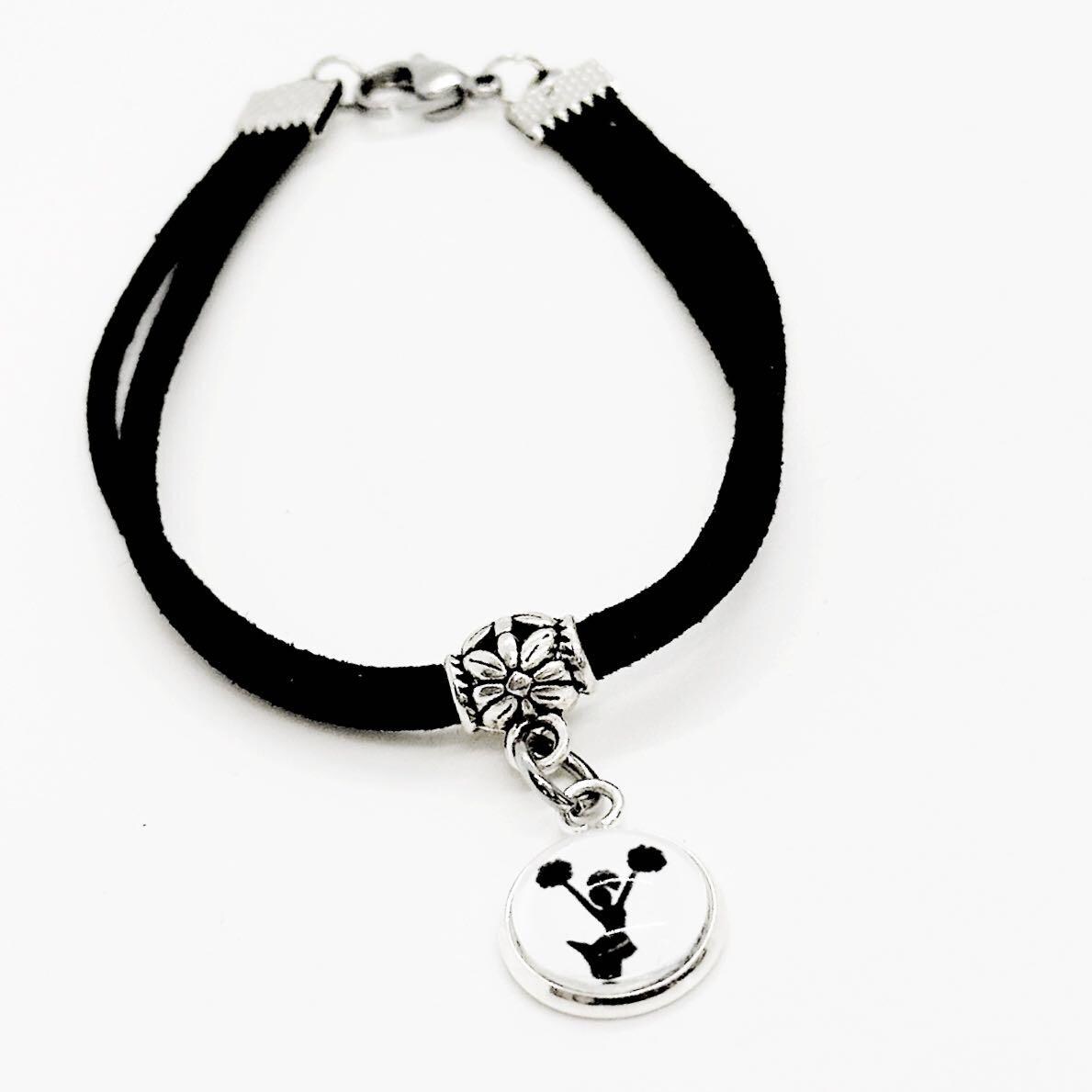 This is a beautiful black faux suede bracelet with a cheerleader cabochon charm on it.