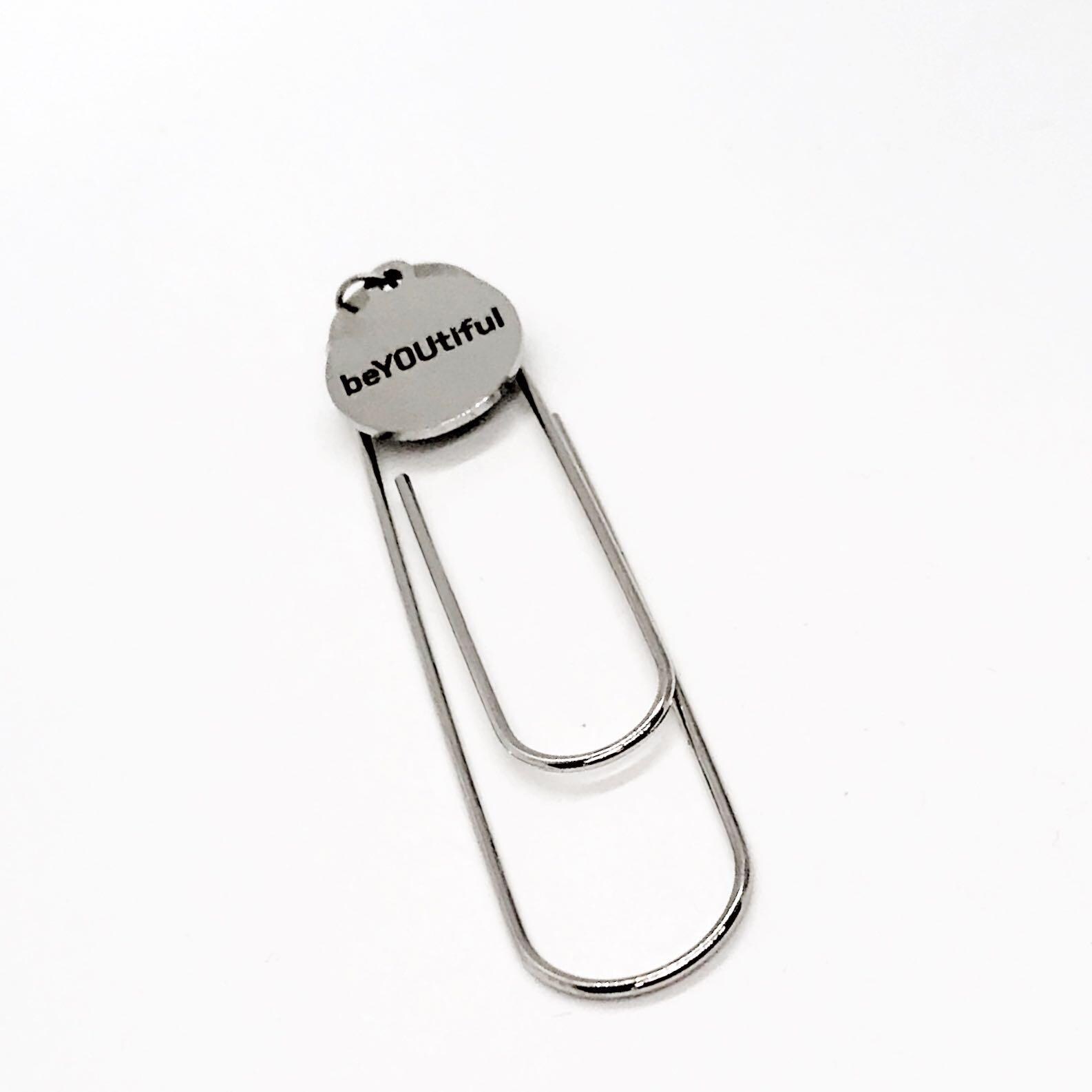 This is a great large paper clip style bookmark that has a stainless steel laser engraved charm with “beyoutiful” on it. It can be used as a bookmark, page marker, or planner book mark.