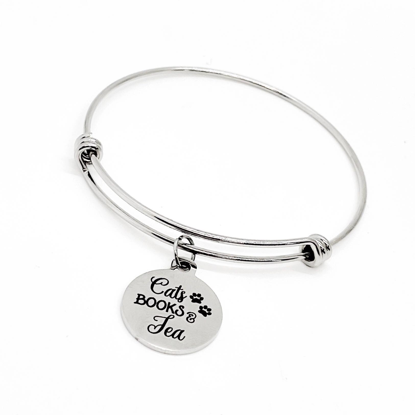This is a great bracelet with a stainless steel laser engraved charm on it. The charm has “Cats Books Tea” on it.
