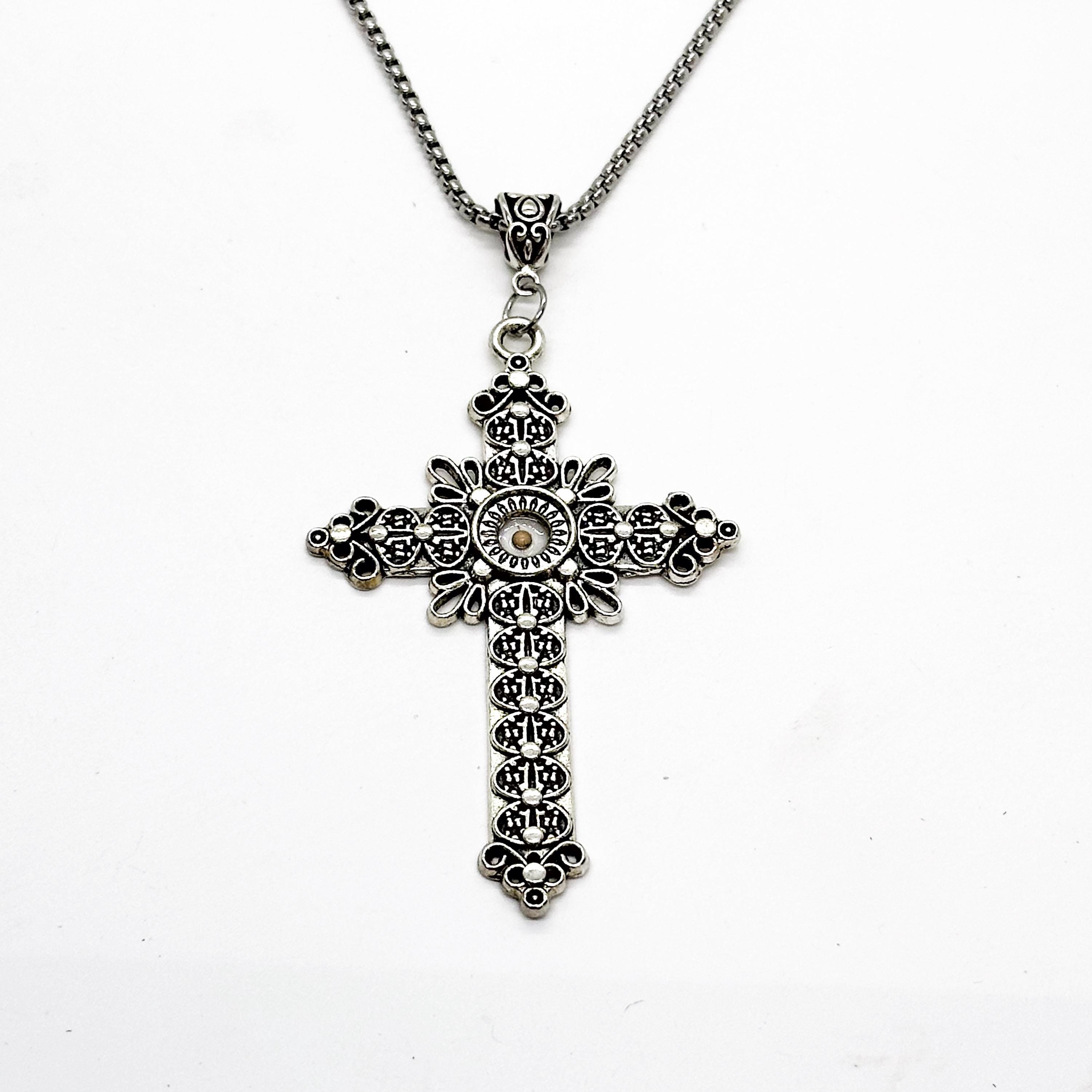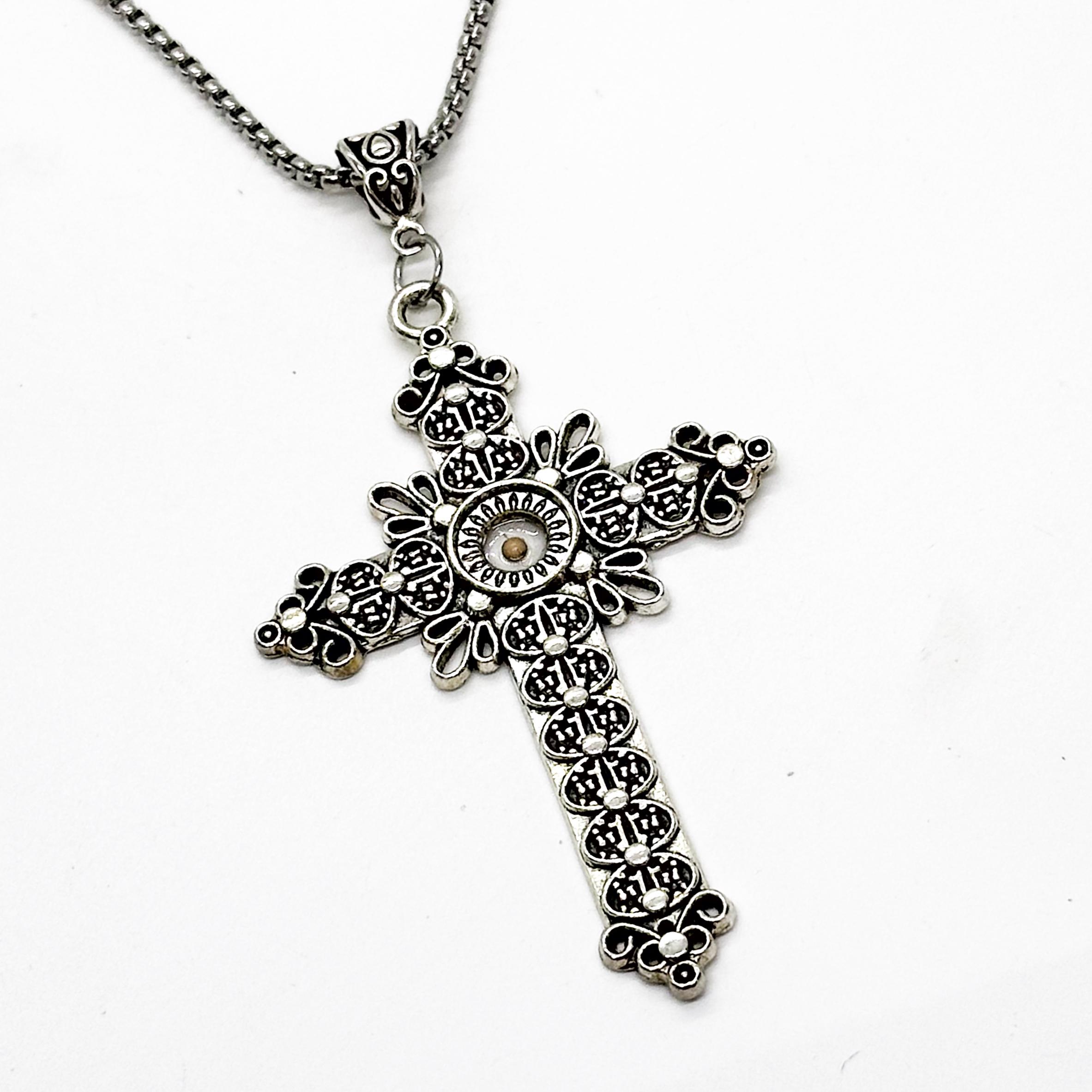 This beautiful necklace would make wonderful gift to remind someone that with faith the size of a mustard seed, we can move mountains. It is a 3 inch cross with a mustard seed at the center on a stainless steel necklace.