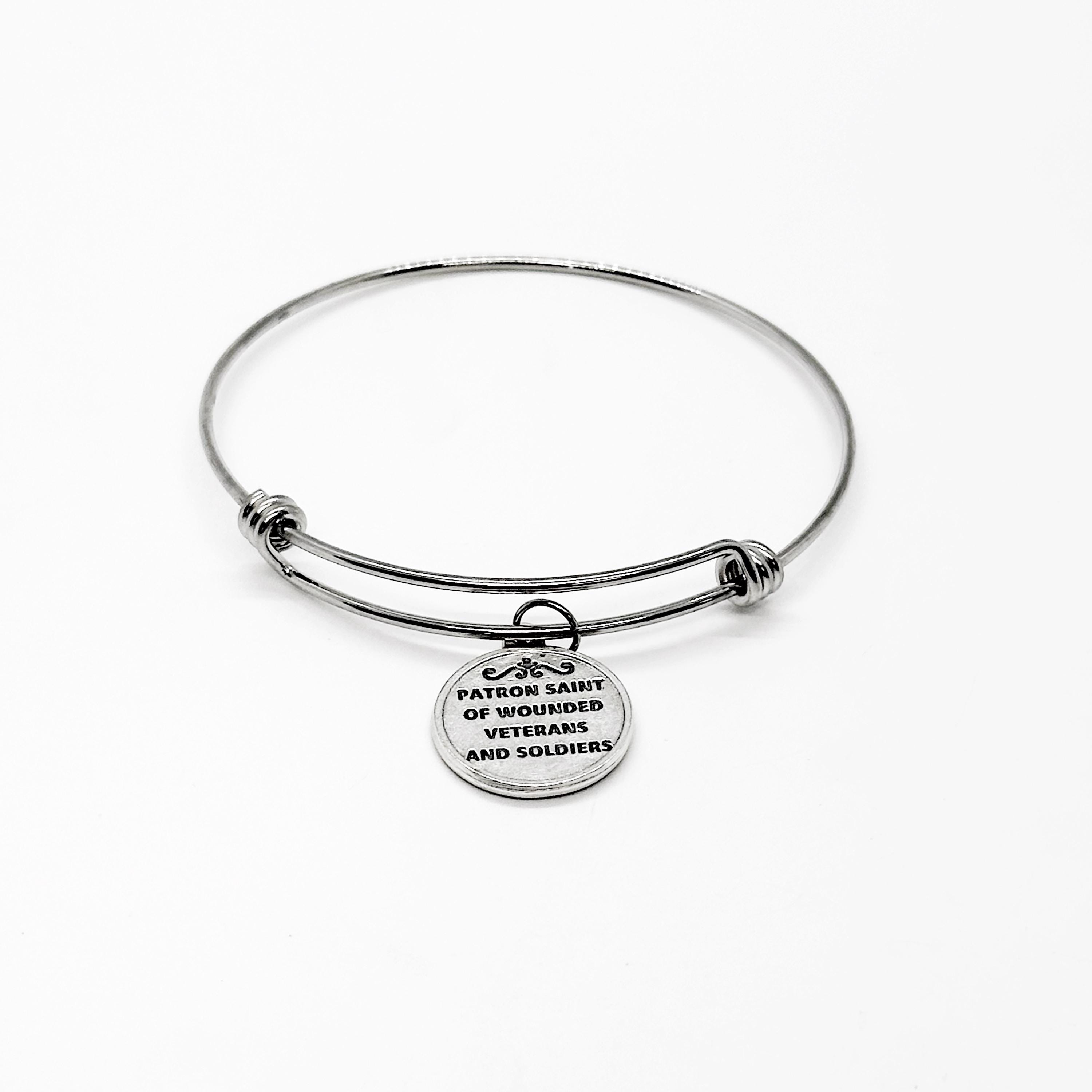 This is a beautiful bangle bracelet with a charm with a Saint Ignatius of Loyola, Patron Saint of Wounded Veterans and Soldiers. The charm measures approx. 3/4 inch.
